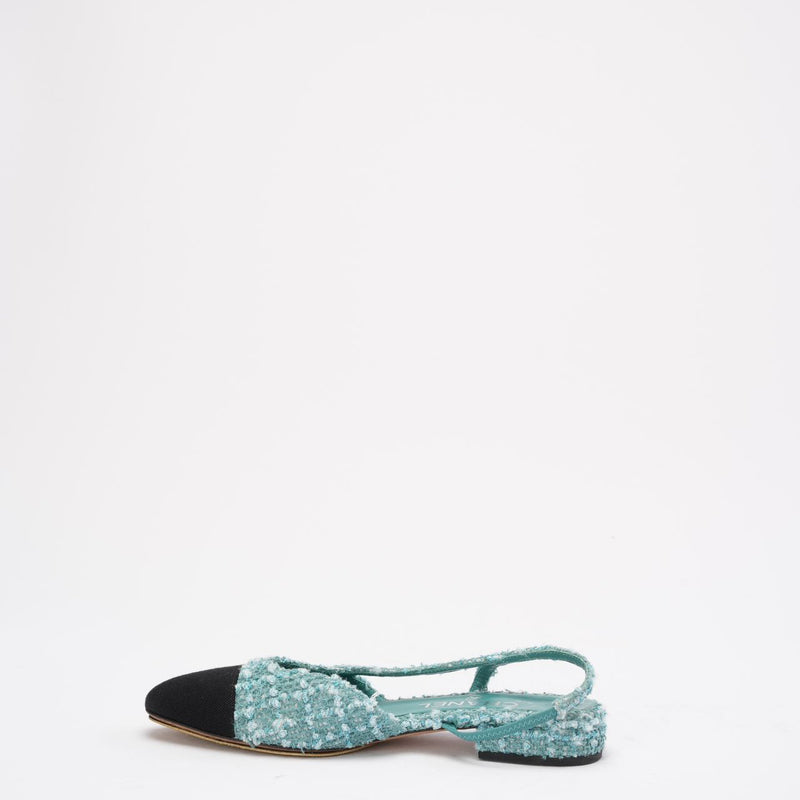 A fresh and elegant take on a Chanel icon, these slingback heels are crafted from textured tweed in a striking turquoise and green palette, offering a refined pop of color. The classic cap-toe design is finished with the signature interlocking CC logo, blending timeless House codes with a modern, playful twist.
