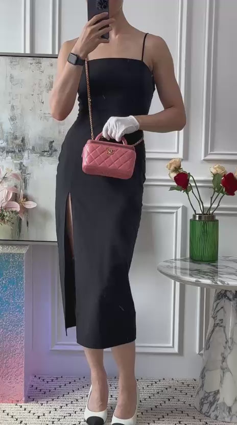 This Chanel Vanity Rectangular Top Handle Bag has a feminine and contemporary design. It is made of soft pink leather and has gold-tone hardware. Made in 2022, it has a top handle, diamond quilting, the CC turn-lock charm, and a structured silhouette. Its multipurpose design allows it to be worn crossbody for a laid-back elegance, on the shoulder for daytime to evening wear, or carried by the handle for a stylish handheld appearance. This collectible vanity bag, which is playful yet elegant, gives Chanel's classic legacy a dash of modern charm. This preloved bag will arrive in very good condition.
