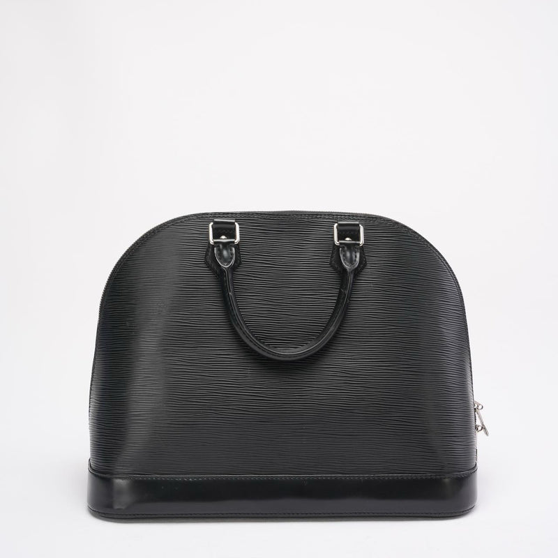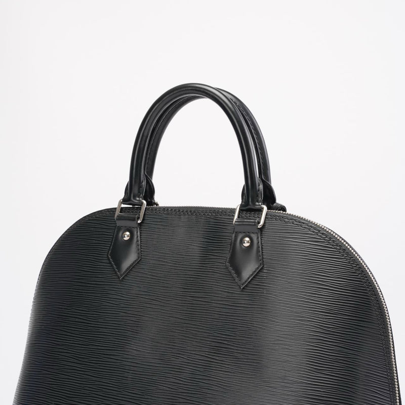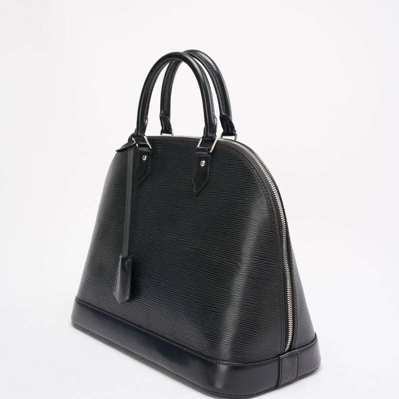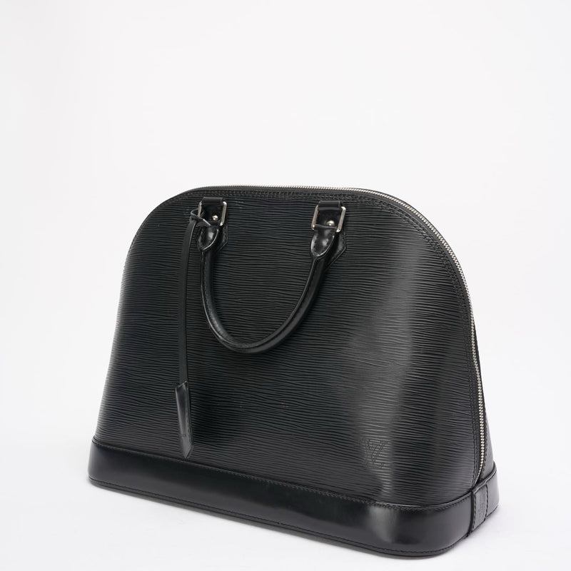 A timeless Louis Vuitton icon, the Alma PM is crafted from durable black Epi leather, renowned for its textured finish and exceptional resilience. The structured, architectural silhouette is complemented by sleek silver-tone hardware, lending a modern edge to this classic design.
