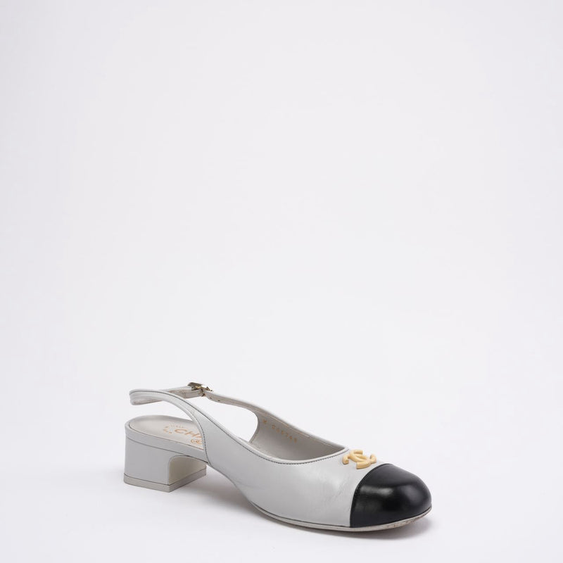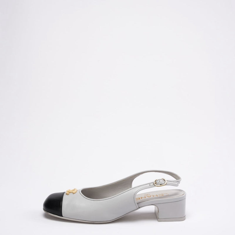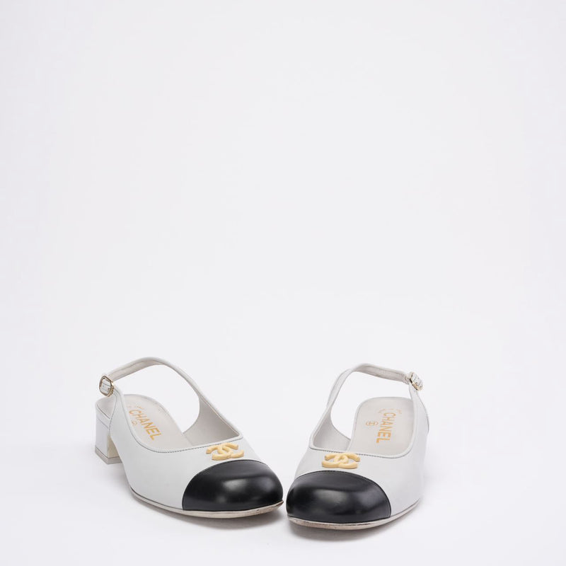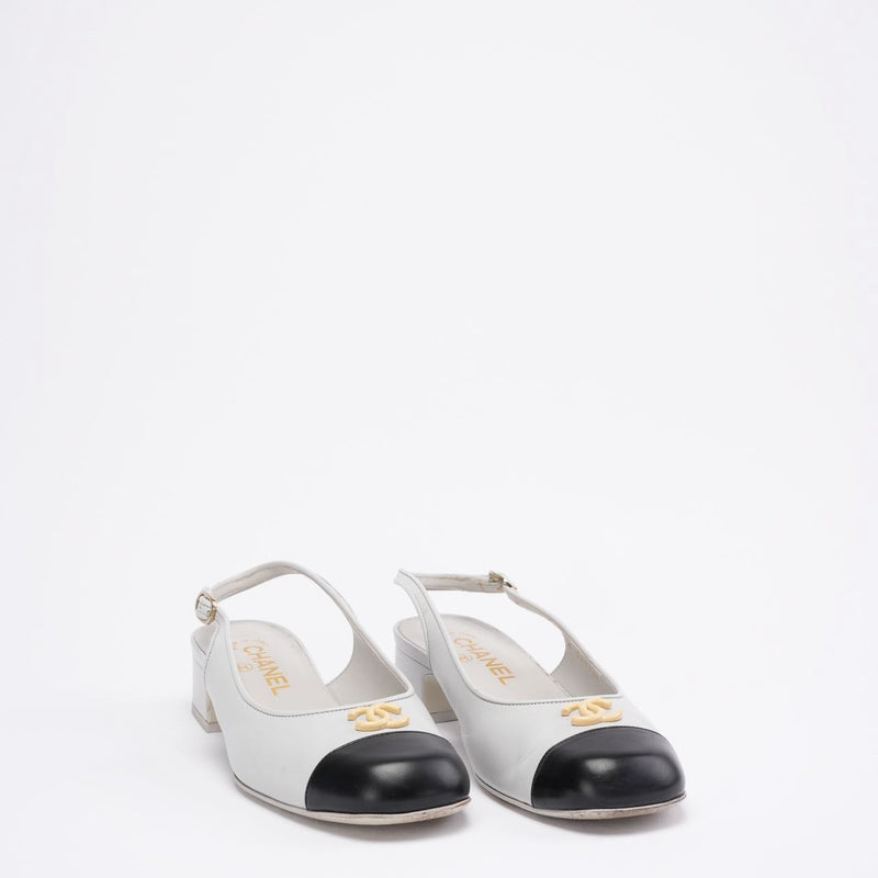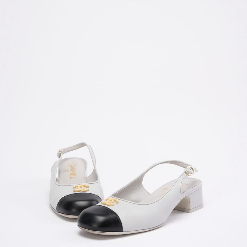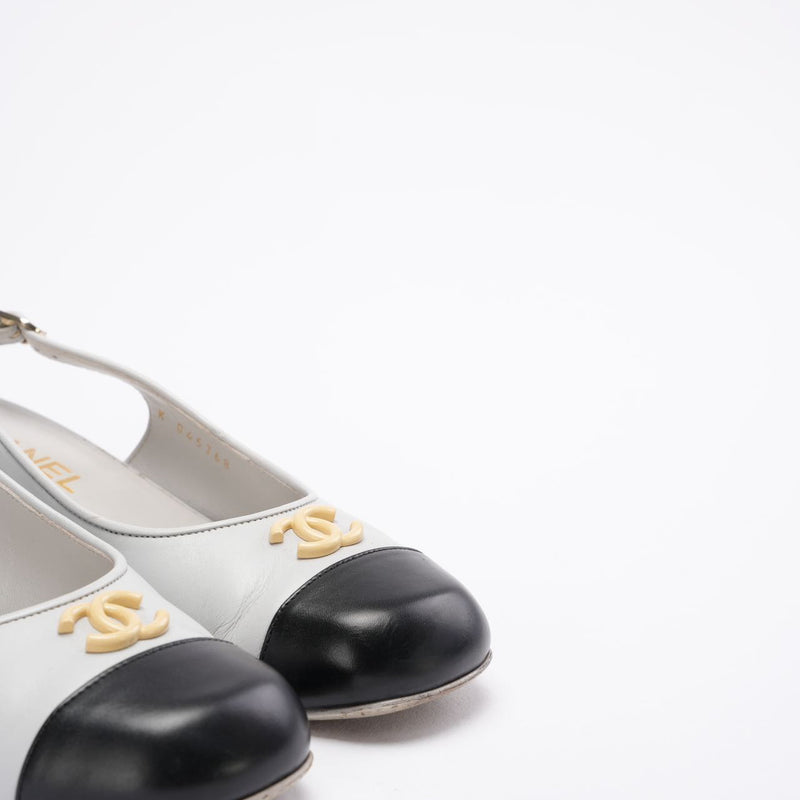 Chanel 25A CC Schwarze/Weiße Leder-Mule mit spitzer Zehenpartie, Größe 37