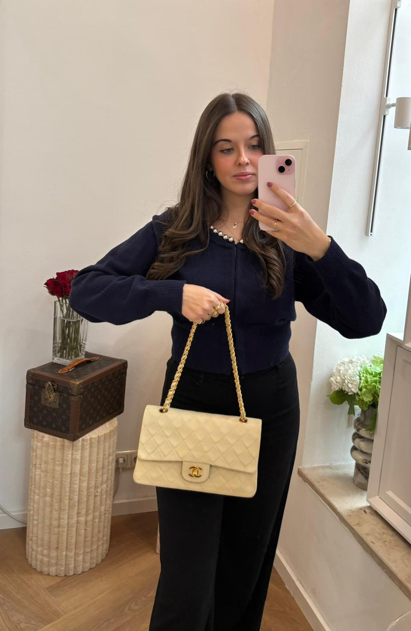 A timeless gem that epitomises Chanel's timeless elegance is the Chanel Beige Vintage Medium Classic Flap Bag in Lambskin Leather (1996–1997). This vintage beauty features the maison's signature diamond quilting and the recognisable CC turn-lock clasp. It is made from soft beige lambskin leather and is embellished with 24k gold-plated hardware. The medium size provides the ideal ratio of functionality to elegance. This piece is adaptable for both day and nighttime wear thanks to its leather-threaded chain strap, which can be worn crossbody or on the shoulder. A timeless collector's item that never goes out of style, it is a genuine vintage gem that embodies the heyday of Chanel craftsmanship.