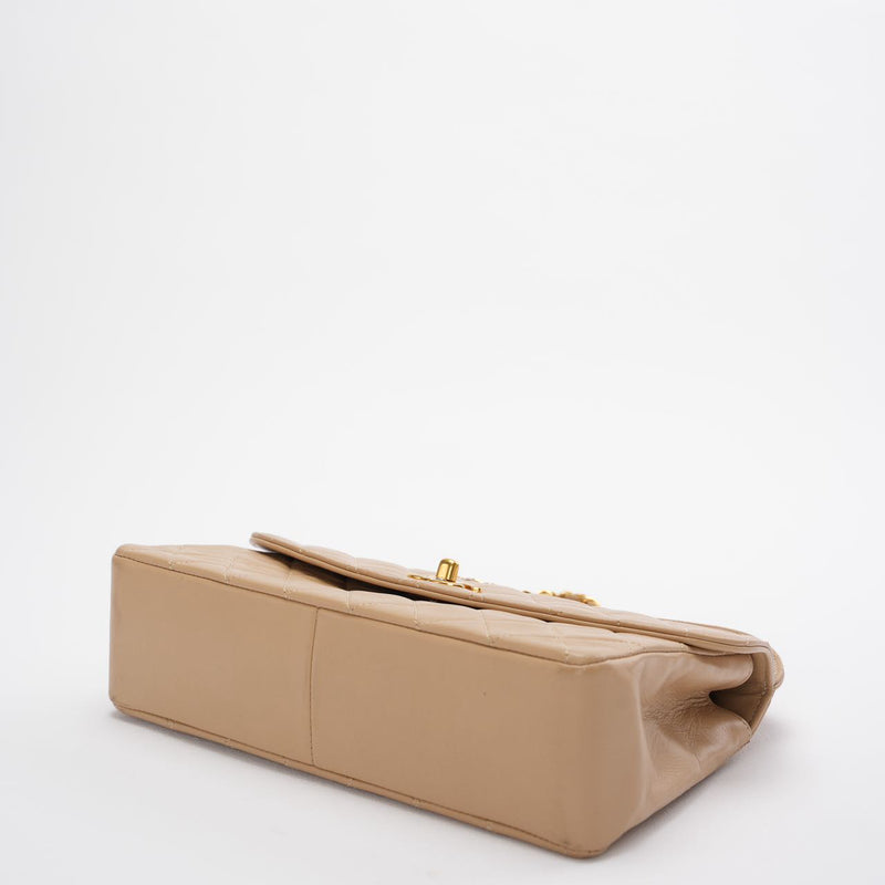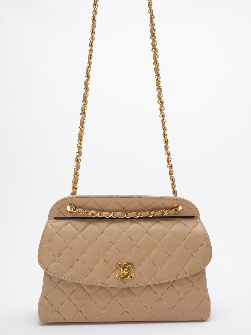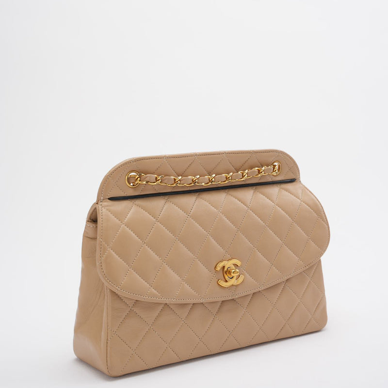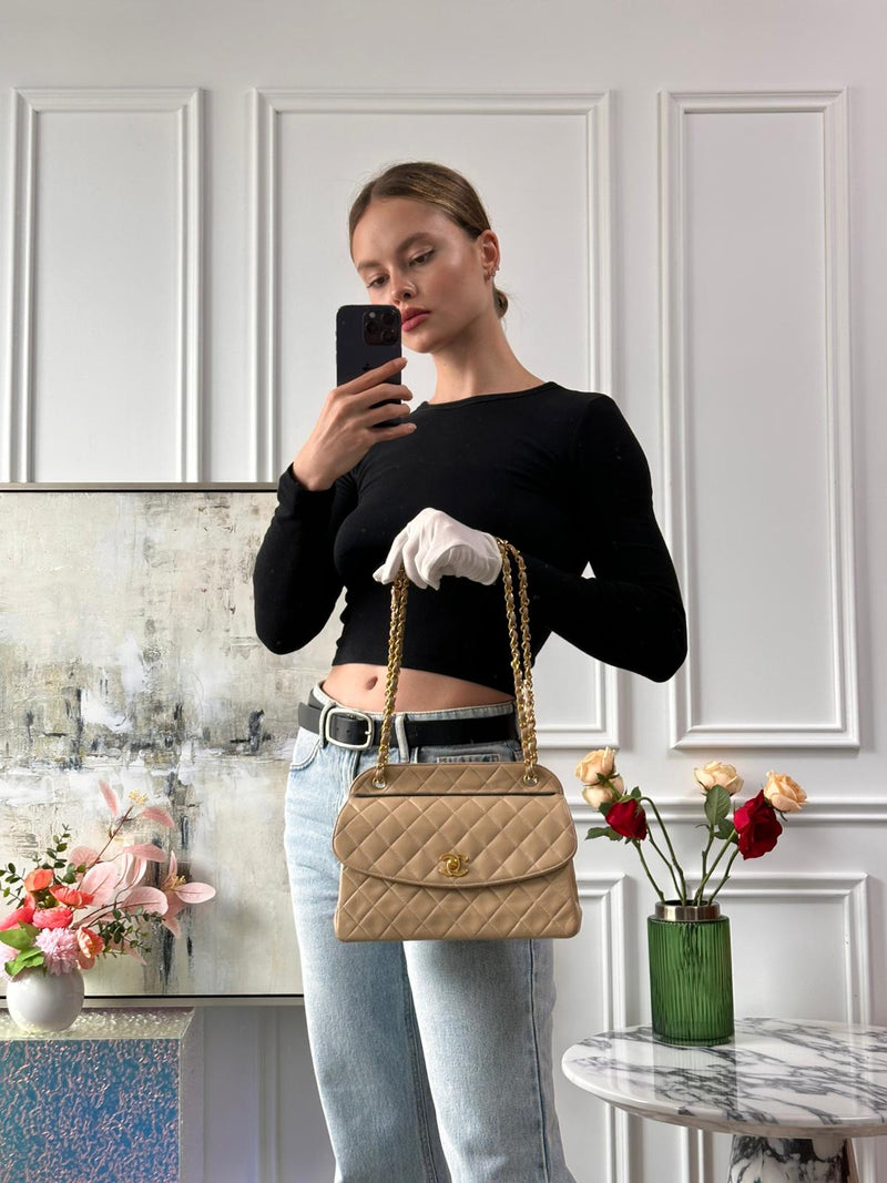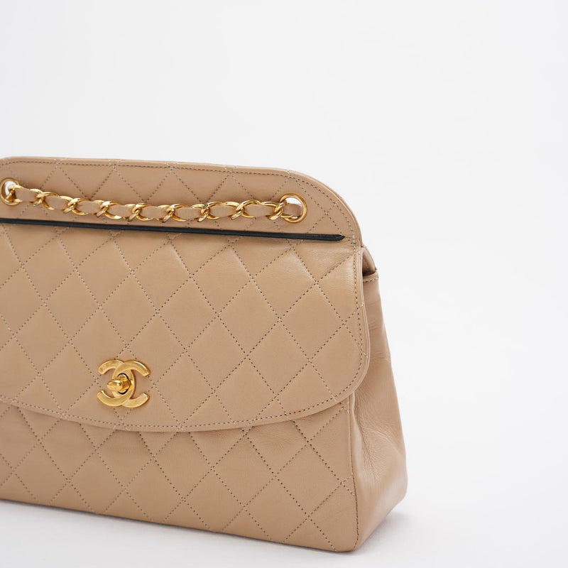 A gorgeous combination of traditional Chanel style and modern design can be found in the Chanel Beige Vintage Timeless Trendy Flap Bag (2011–2012). This item, crafted from opulent beige lambskin leather, showcases the brand's distinctive quilted design and is accented with 24k gold hardware for a sophisticated touch.