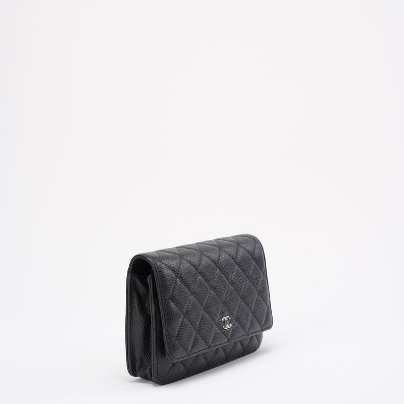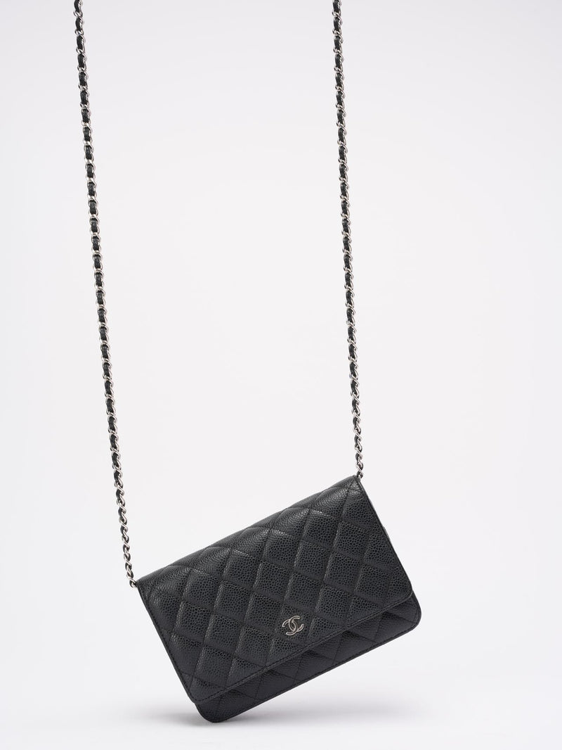 Diese moderne und zeitlos elegante Chanel Wallet on Chain aus dem Jahr 2020 ist aus strapazierfähigem, schwarzem Caviar-Leder gefertigt, das für seine strukturierte Oberfläche und außergewöhnliche Langlebigkeit geschätzt wird. Die charakteristische Rautensteppung wird durch elegante silberfarbene Beschläge und den ikonischen CC-Verschluss ergänzt und verleiht der Tasche einen raffinierten, zeitgemäßen Look.
