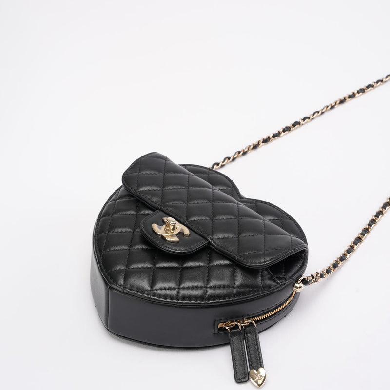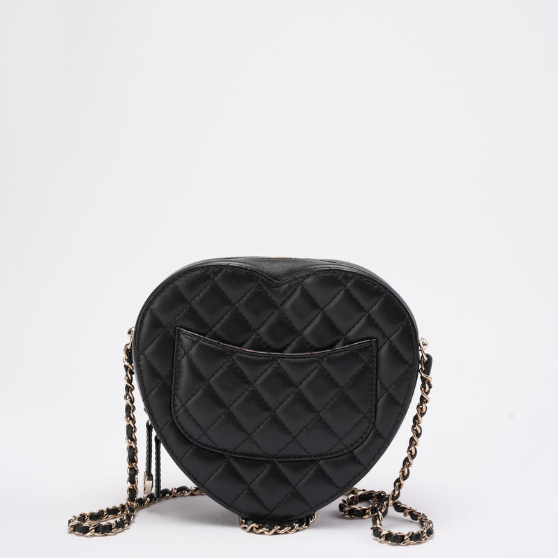 Schick, romantisch und unverkennbar Chanel: Diese gebrauchte schwarze Lammleder-Clutch „In Love Heart“ mit Kette ist eine moderne Ikone aus der Kollektion 2022. Gefertigt aus luxuriös weichem Lammleder , besticht sie durch das charakteristische Steppmuster und ein verspieltes , herzförmiges CC-Motiv , akzentuiert durch goldfarbene Beschläge für einen eleganten Abschluss.