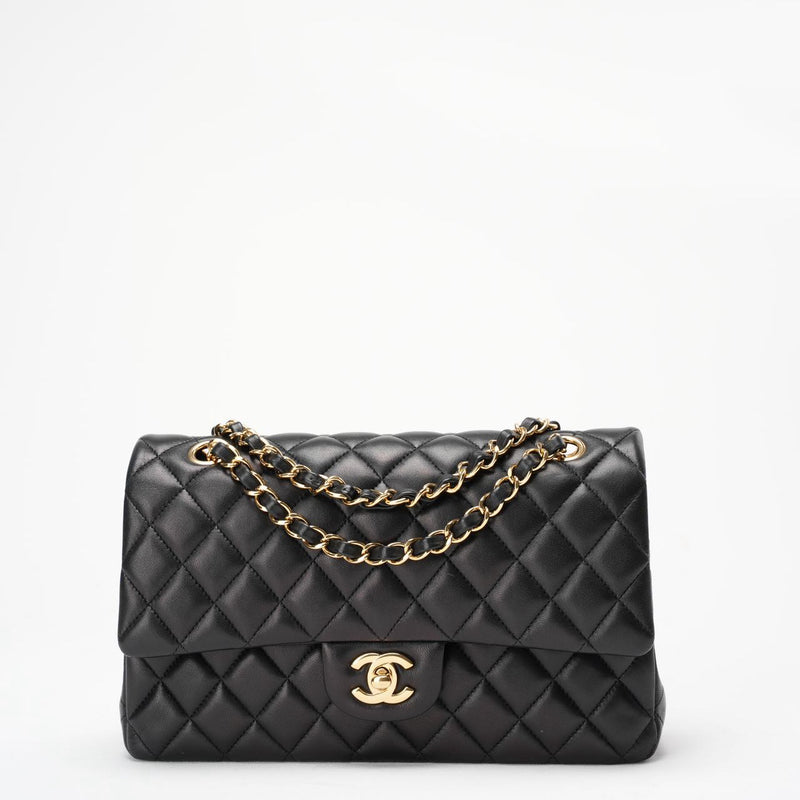 The Chanel Black Medium Double Flap Bag (2014–2015) is an enduring symbol of luxury and sophistication. Crafted from soft black lambskin leather with Chanel’s signature diamond quilting, this classic piece features the iconic interlocking CC turn-lock closure in gold-tone hardware. The double flap design enhances its structure and security, while the leather-woven chain strap allows for versatile wear — either on the shoulder or crossbody. With its spacious yet elegant interior lined in burgundy leather, this timeless Medium Classic Flap Bag perfectly captures the essence of Chanel’s heritage, making it a must-have investment for any luxury collector.