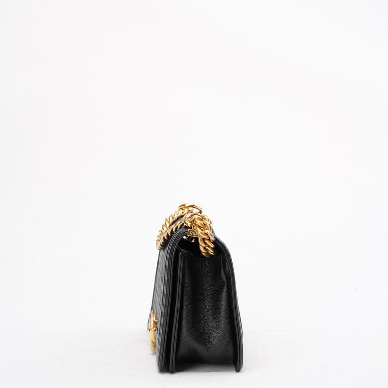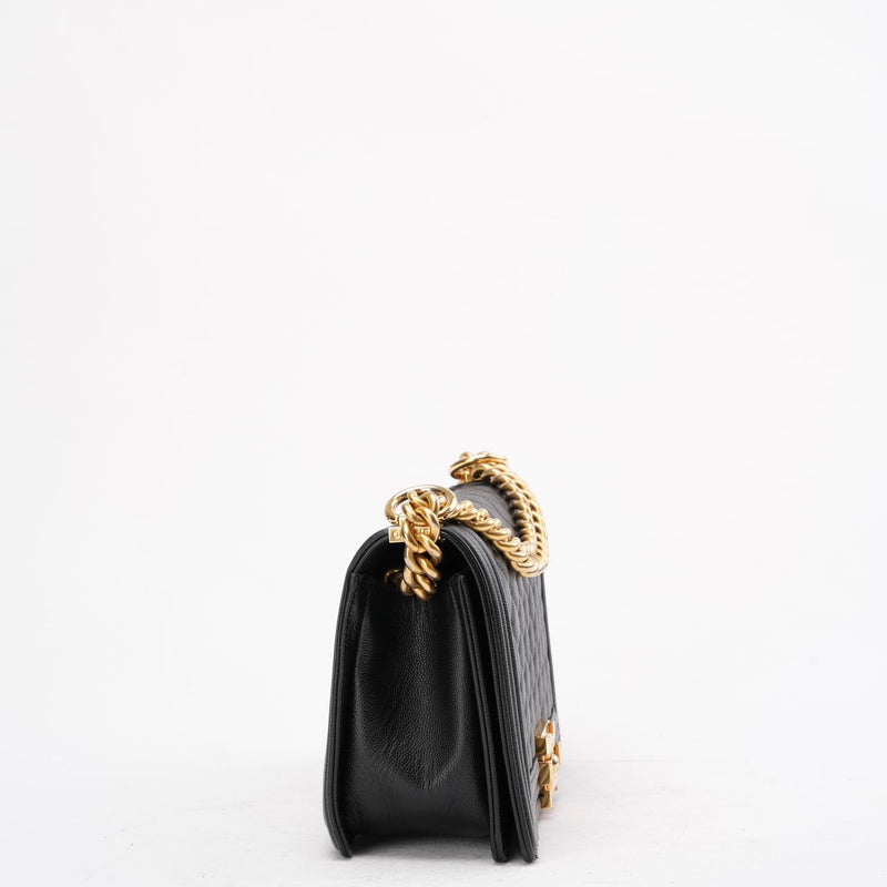 The Chanel Boy Medium Black Flap Bag in Quilted Caviar Leather (2019) is a modern Chanel icon that blends edgy structure with timeless luxury. Crafted from durable black caviar leather, it showcases the brand’s signature diamond quilting and features the distinctive Boy push-lock clasp in antique gold-tone hardware.