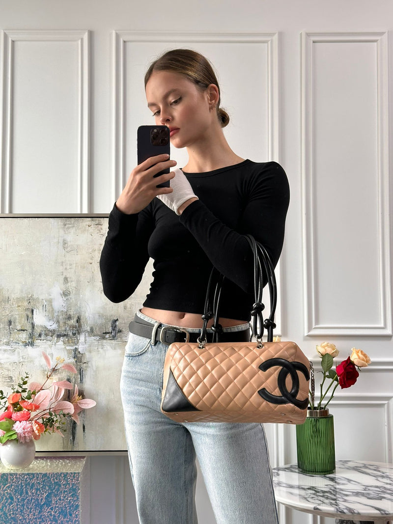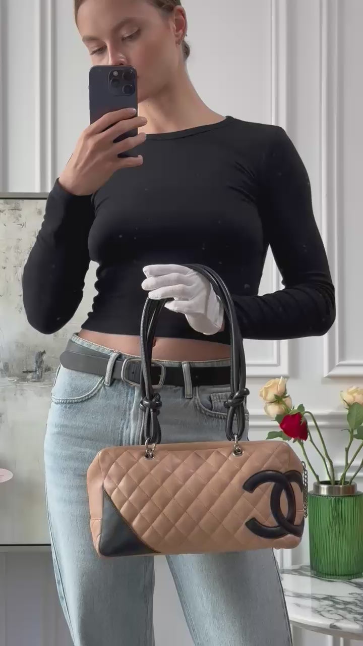 This Chanel Cambon Bowler Bag, a highlight of the brand's early 2000s collection, is made of black quilted leather, features the oversized beige CC logo, and is accentuated with silver-tone hardware. It was manufactured in 2004 and has the line's distinctive bold design, a roomy zip-top interior, and a structured bowler silhouette with dual rolled leather handles. For a polished look during the day, wear it by hand or on the arm; alternatively, pair it with casual attire for an effortlessly stylish edge. This timeless icon from the coveted Cambon line is both useful and collectible. This preloved bag will come in very good condition. Also visit the Chanel Vintage Bowler Handbag Beige Caviar Leather.