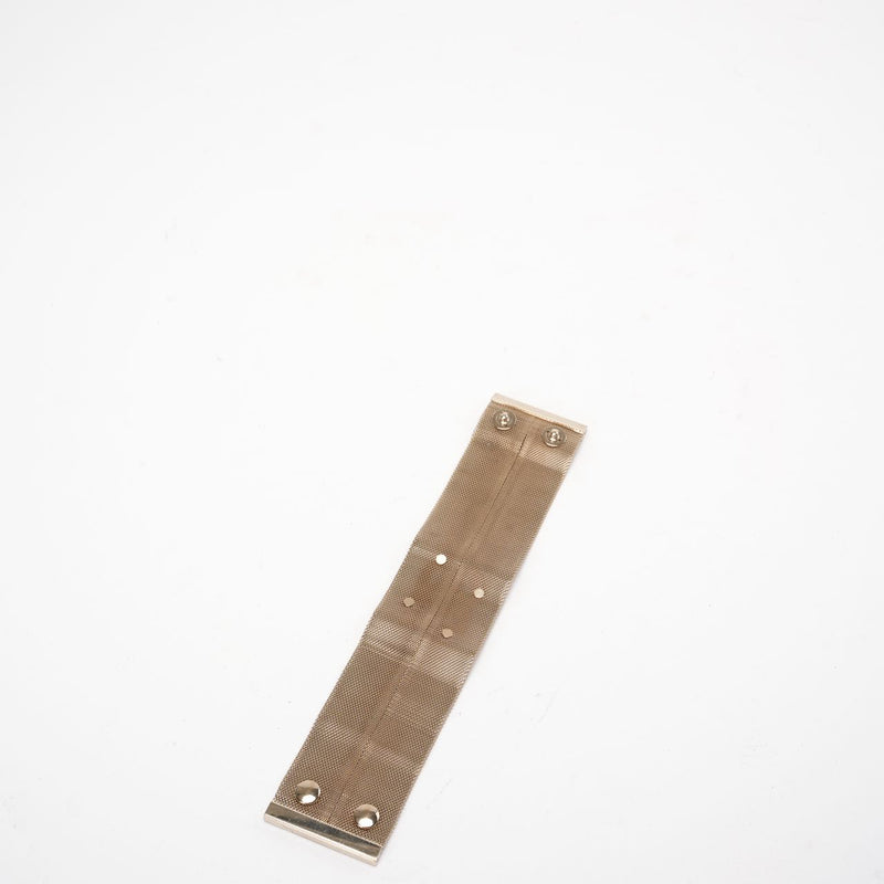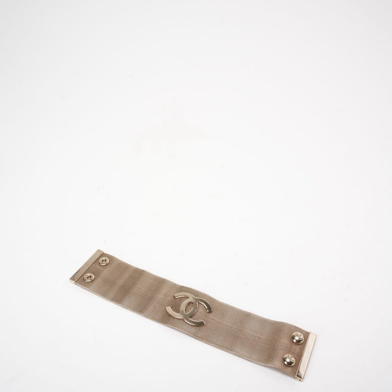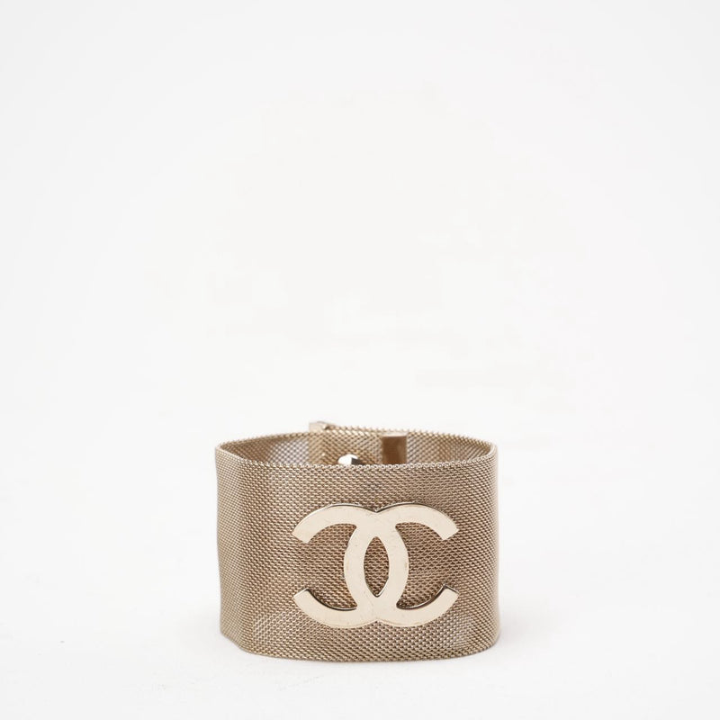 A striking Chanel accessory, this Metal Mesh CC Bracelet is crafted in light gold-tone hardware with a sleek mesh band and finished with the iconic interlocking CC logo. Elegant yet modern, it offers a versatile design that can be worn as a statement piece on its own or layered with other bracelets for a chic, stacked look.
