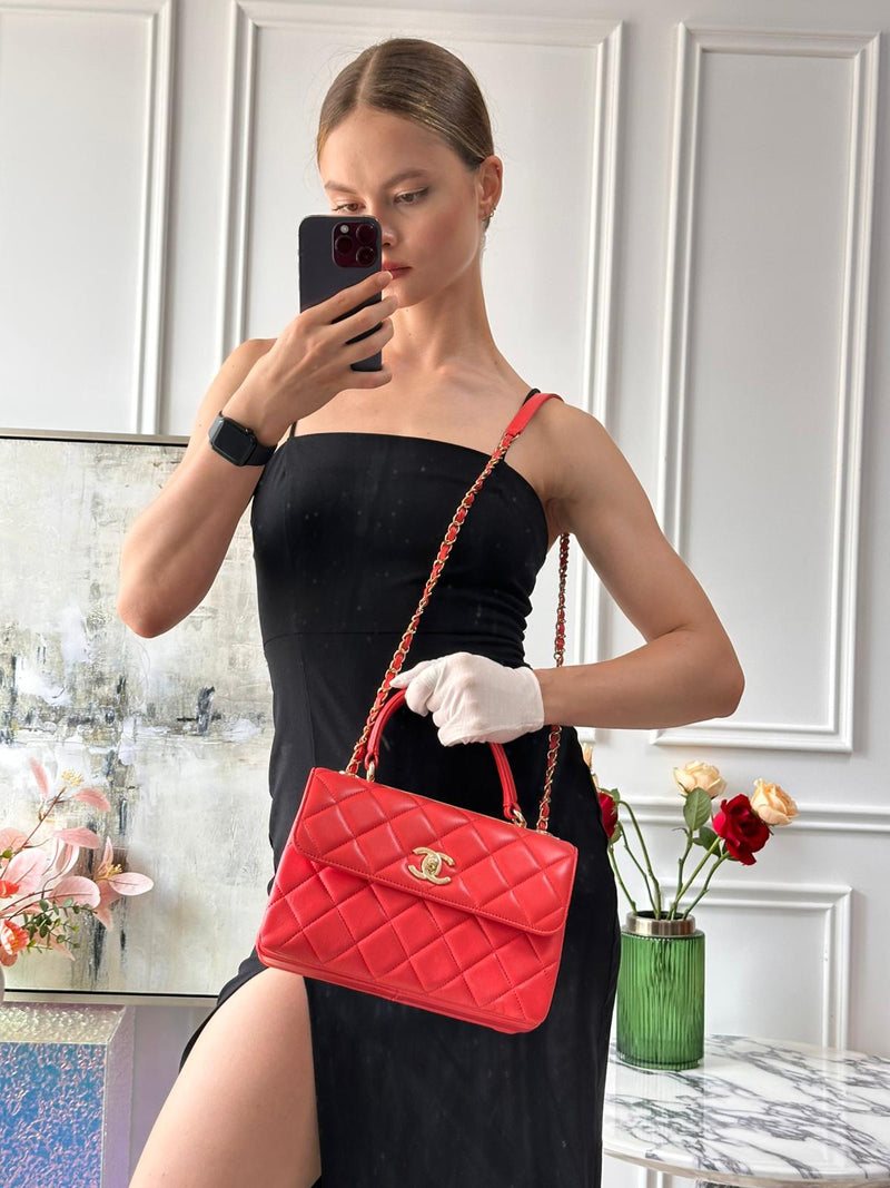 Gebrauchte Chanel Red Small Trendy CC Bag aus luxuriösem Lammleder mit eleganten Beschlägen in Champagnergold. Diese ikonische Top-Henkeltasche besticht durch das charakteristische CC-Logo, die strukturierte Silhouette und zeitlosen Charme. Ein seltenes und raffiniertes Statement-Stück – perfekt für jede Garderobe. Entdecken Sie authentische Chanel-Taschen bei Miloura.
