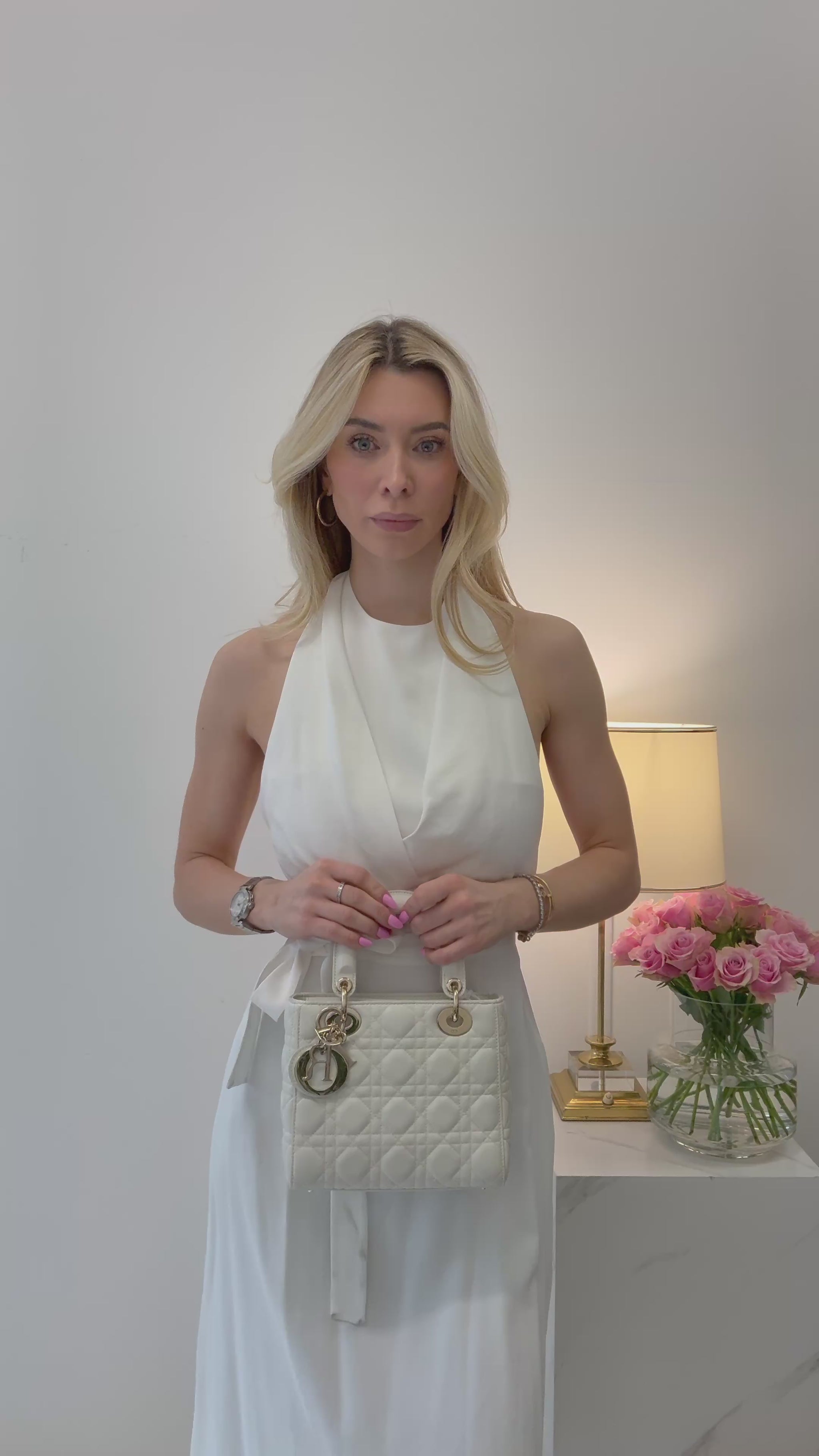 Diese Small Lady Dior aus dem Jahr 2017 ist ein zeitloser Ausdruck der ikonischen Eleganz von Dior. Sie ist aus geschmeidigem, weißem Cannage-Lammleder gefertigt und präsentiert das charakteristische Steppmuster des Hauses mit raffinierter Struktur und Tiefe. Das strahlend weiße Leder wird durch polierte goldfarbene Beschläge und die charakteristischen DIOR- Anhänger wunderschön akzentuiert und verleiht der Tasche einen Hauch von klassischem Luxus.