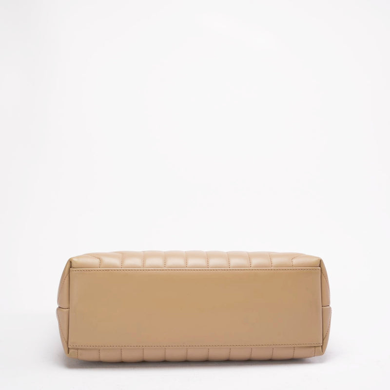 This 2020 Medium LouLou bag, a stylish and adaptable Saint Laurent mainstay, is made of smooth beige leather and features the House's distinctive chevron quilting for a delicately structured, opulent finish. The polished YSL monogram elevates the simple design with classic appeal by adding a striking metallic accent.