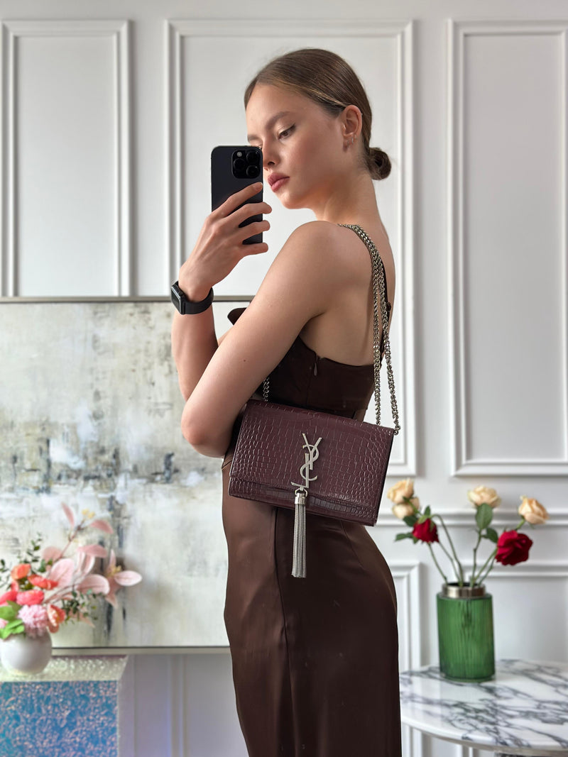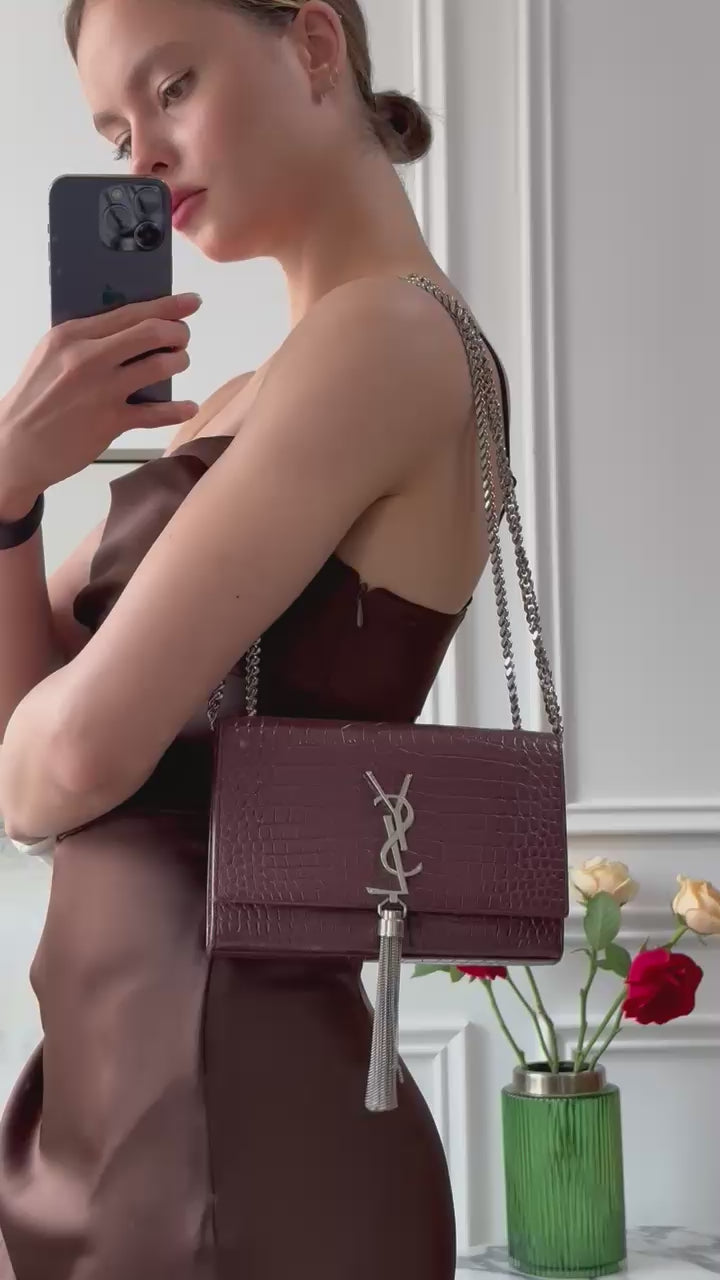 Die Saint Laurent Small Classic Monogram Kate Tassel Satchel aus fein geprägtem Kalbsleder in edlem Burgunderrot ist ein stilvolles Highlight für jeden besonderen Anlass. Mit ihrem luxuriösen Krokodilleder-Look und der charakteristischen YSL-Monogramm-Applikation in goldfarbener Hardware strahlt diese Tasche pure Eleganz und Raffinesse aus.Ein besonderes Detail ist die hängende Quaste, die dem klassischen Design eine dynamische und glamouröse Note verleiht. Die kompakte, dennoch funktionale Form bietet Platz für das Wesentliche wie S martphone, Kartenetui und Lippenstift – ideal für Abendveranstaltungen, Dinner-Dates oder formelle Events.