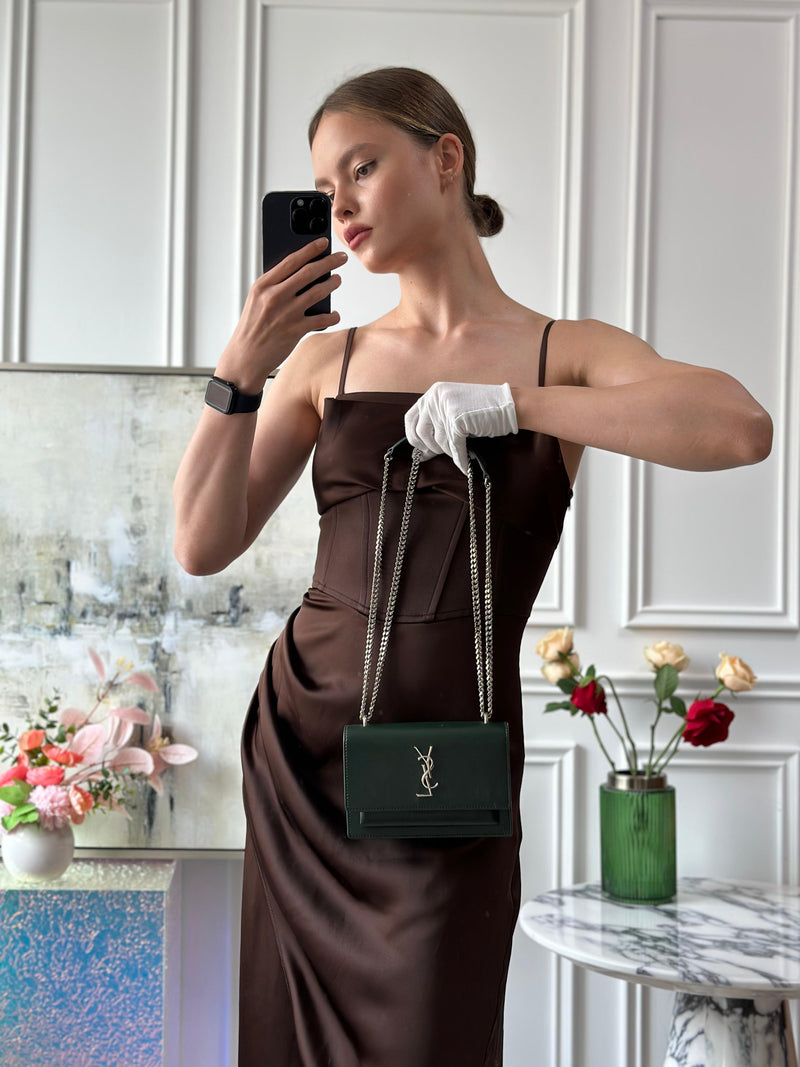 Saint Laurent Sunset Wallet on Chain Mini in Olivgrün mit silberfarbener Hardware