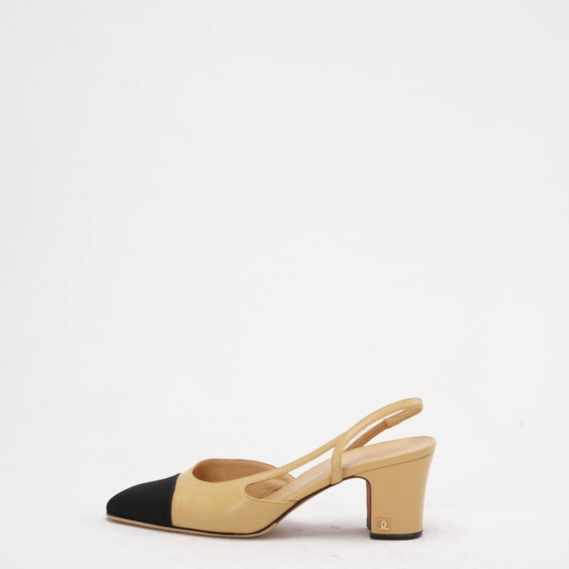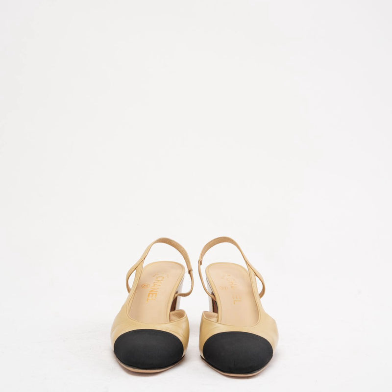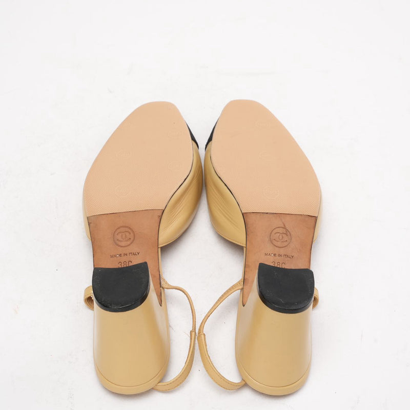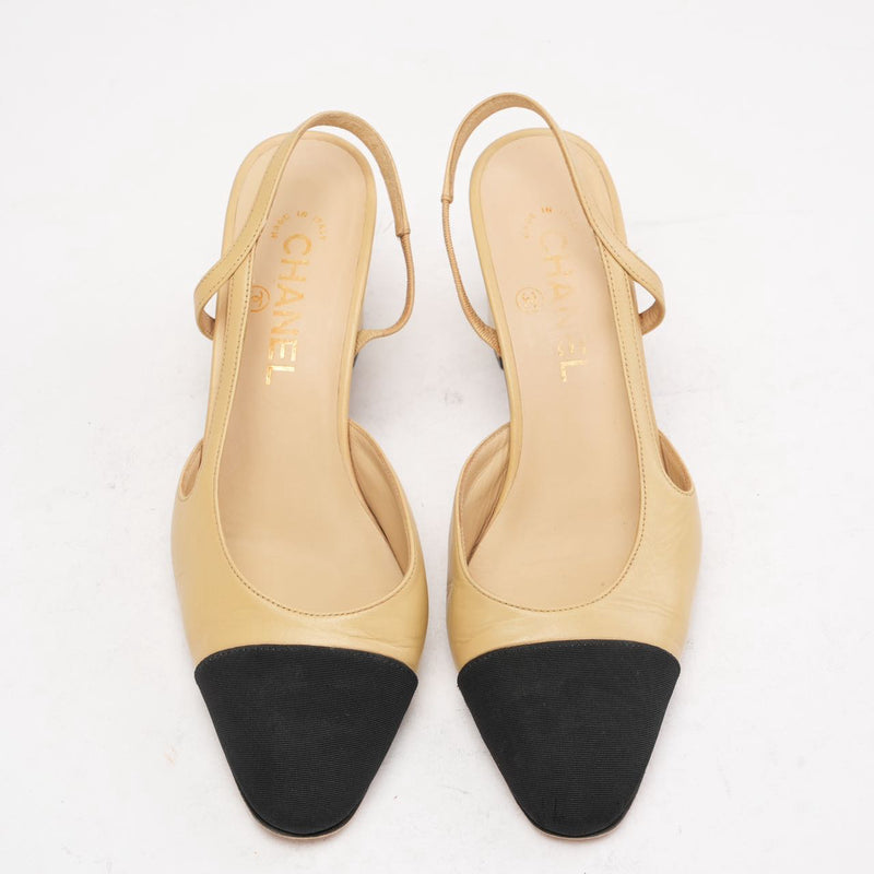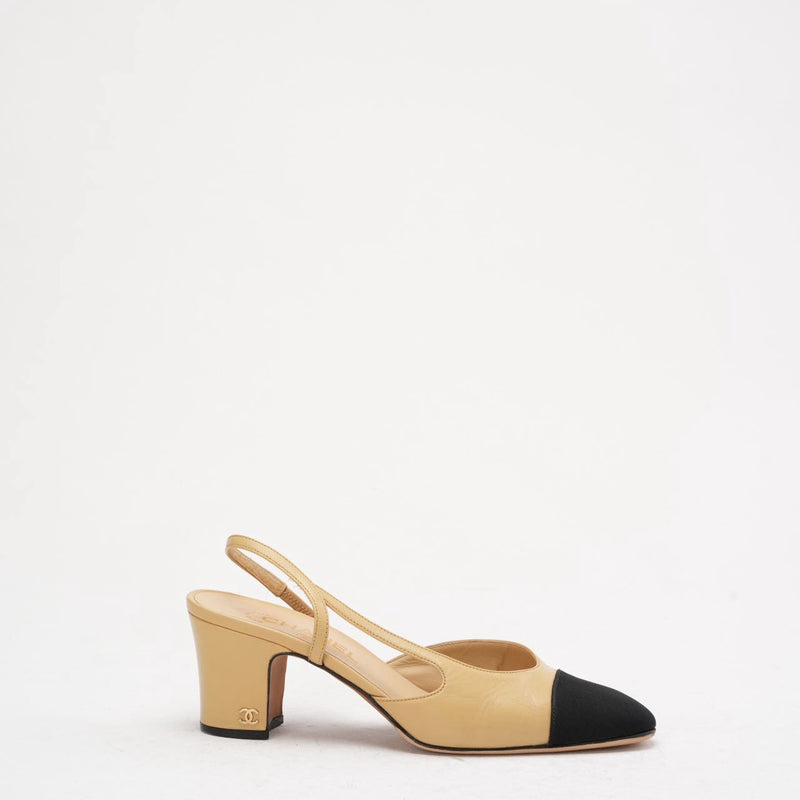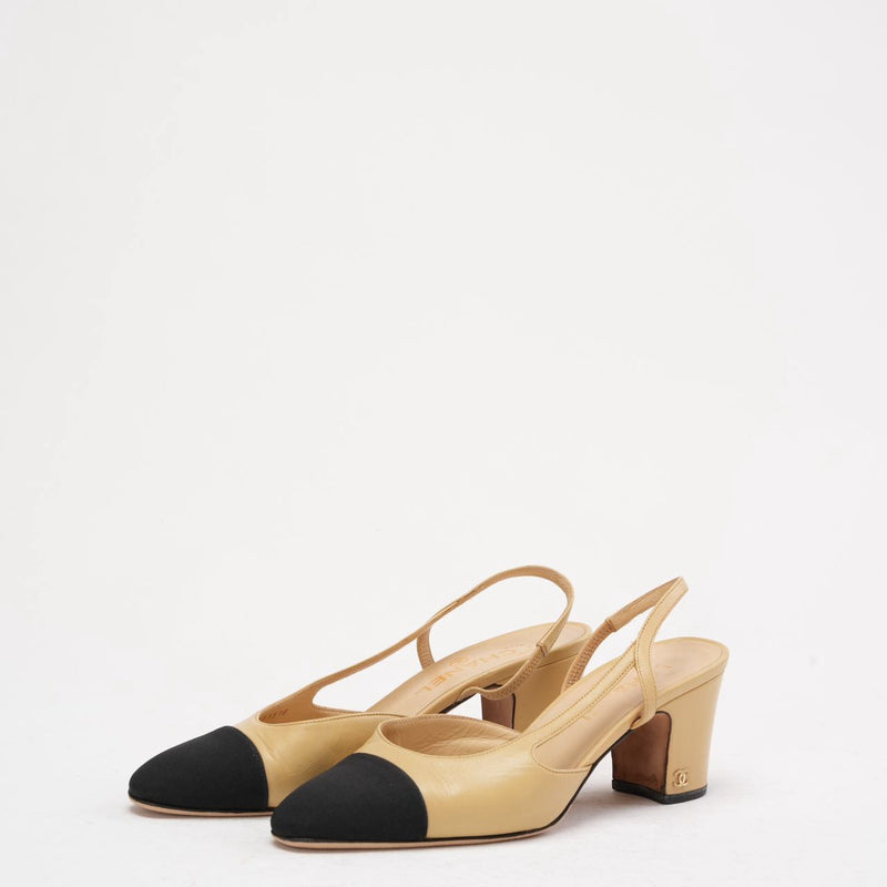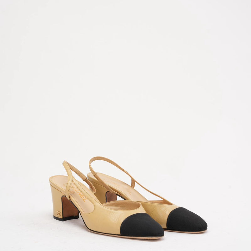 A timeless classic, these Chanel Cap Toe Slingbacks in Black and Beige (size 38C) embody the house’s signature elegance and understated sophistication. Crafted from smooth black leather with contrasting beige leather cap toes, they feature a comfortable mid-height heel and the iconic slingback strap for a secure, chic fit. Perfectly versatile, they transition effortlessly from day to evening wear, exuding refined femininity with every step. Arrives in good pre-loved condition, ready to elevate any wardrobe.