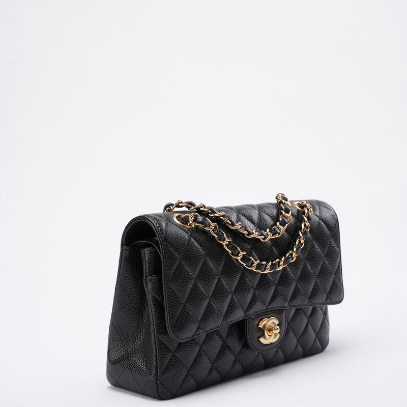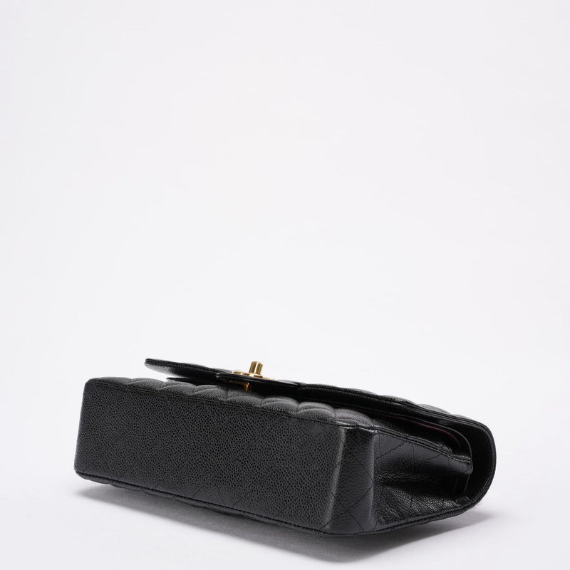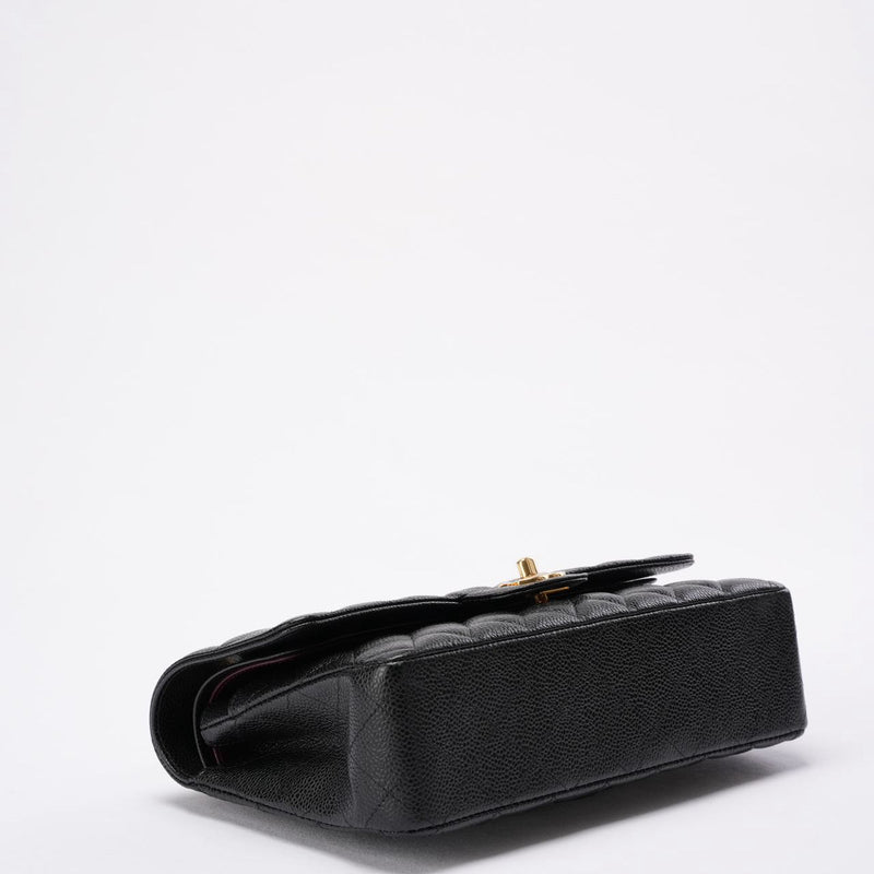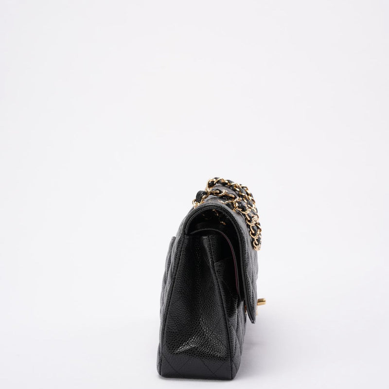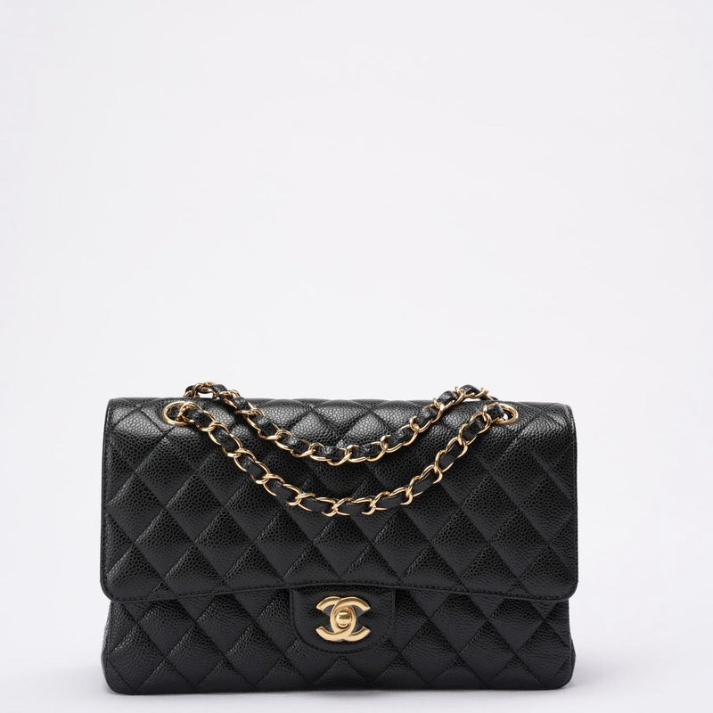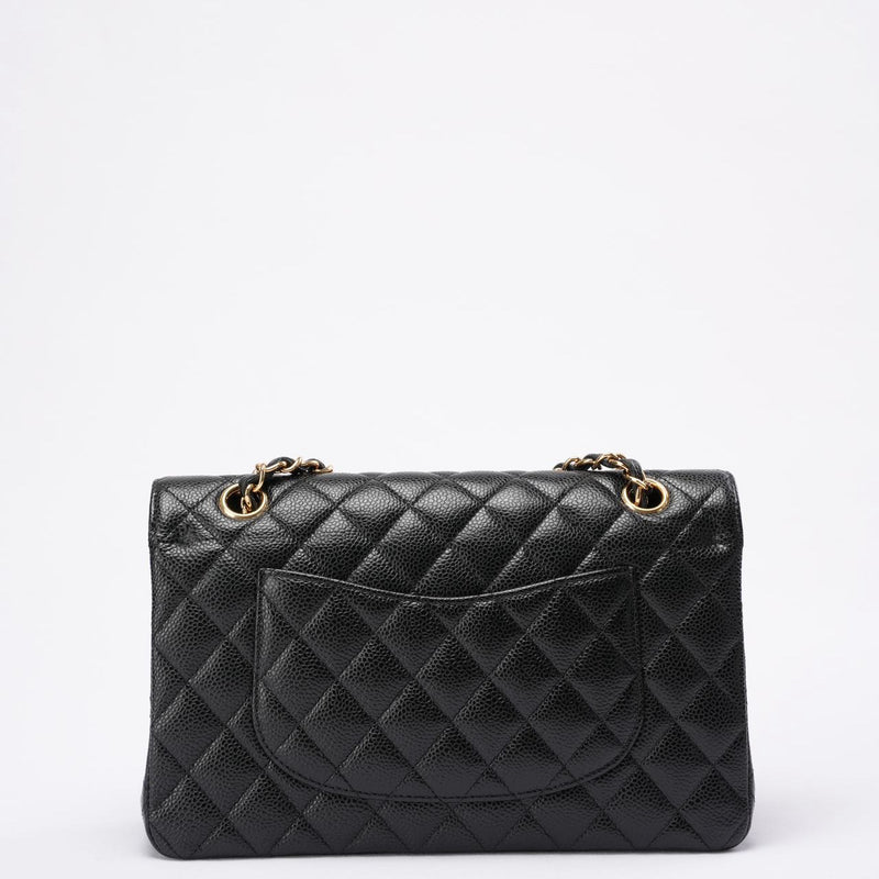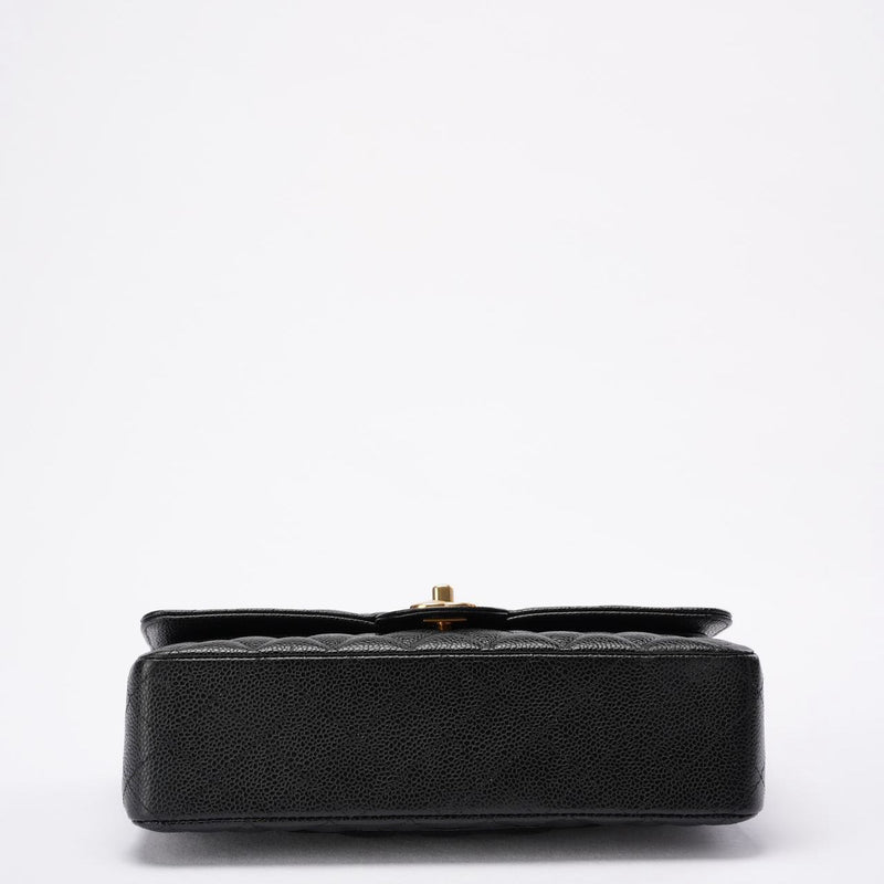 An enduring representation of sophistication and elegance is the Chanel Black Classic Double Flap Bag in Caviar Leather (2019). This classic piece, which is expertly made from sturdy black caviar leather and finished with gold-tone hardware, has an interlocking CC turn-lock clasp and Chanel's trademark diamond quilting. While the leather-threaded chain strap offers versatile styling—it can be worn on the shoulder or crossbody for a polished look—the double flap design adds structure and security. Also, have a look at Chanel Black Classic Double Flap Bag Lambskin.