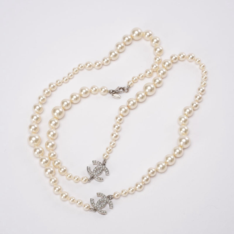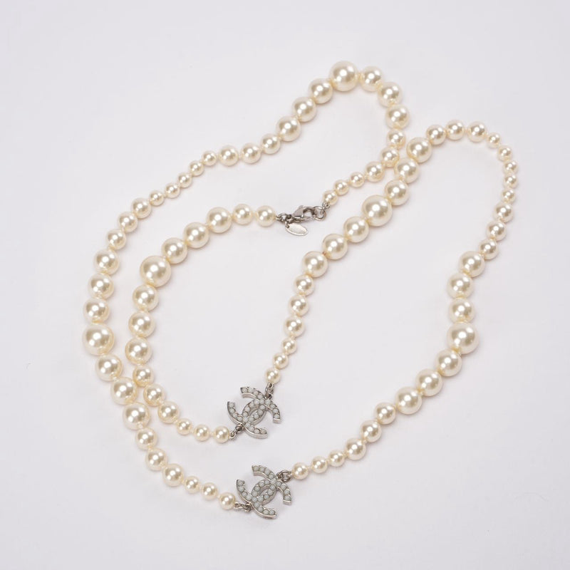 Chanel Classic 2 Gold CC White Bead Pearl Necklace