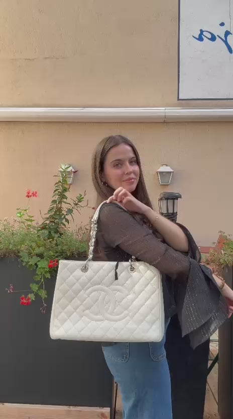 Grand sac cabas Chanel en cuir Cavier blanc avec détails dorés