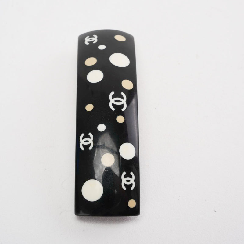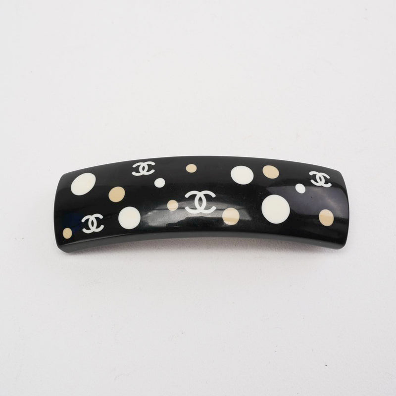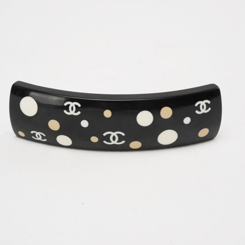 The Chanel Vintage Black and Ecru Polka Dot CC Logo Hair Clip is a playful yet elegant accessory that perfectly captures Chanel’s signature blend of sophistication and charm. Crafted in black resin with ecru polka dots, it features the iconic interlocking CC logo at the center, adding a touch of classic luxury to any hairstyle.