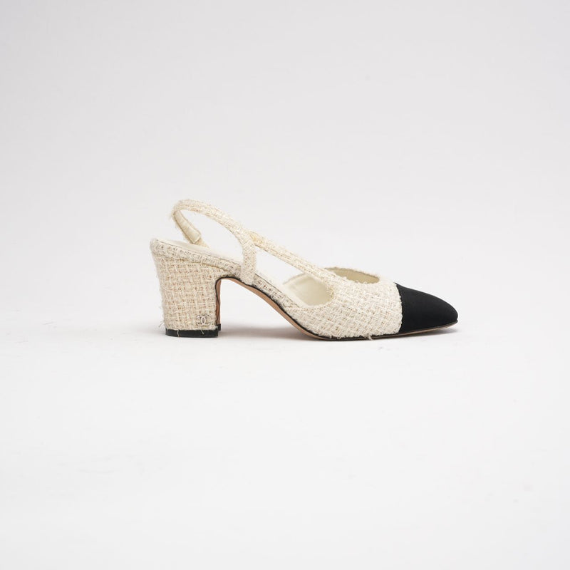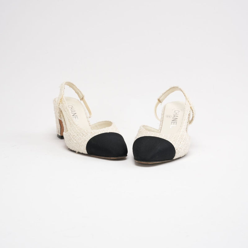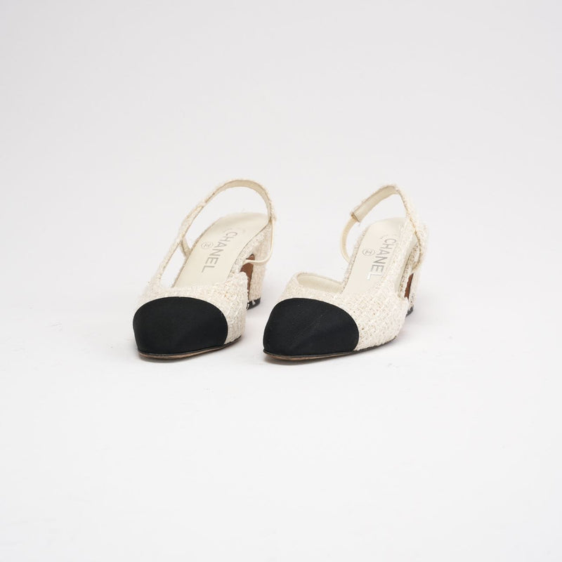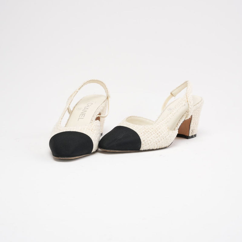 Chanel White / Black Tweed CC Logo Slingback Pumps Size 36