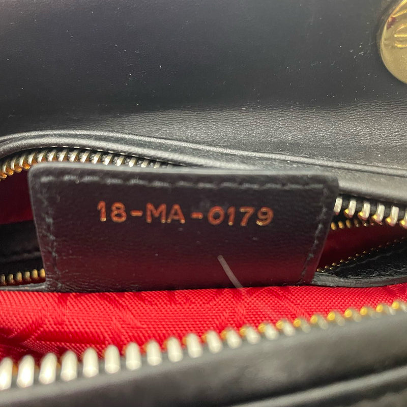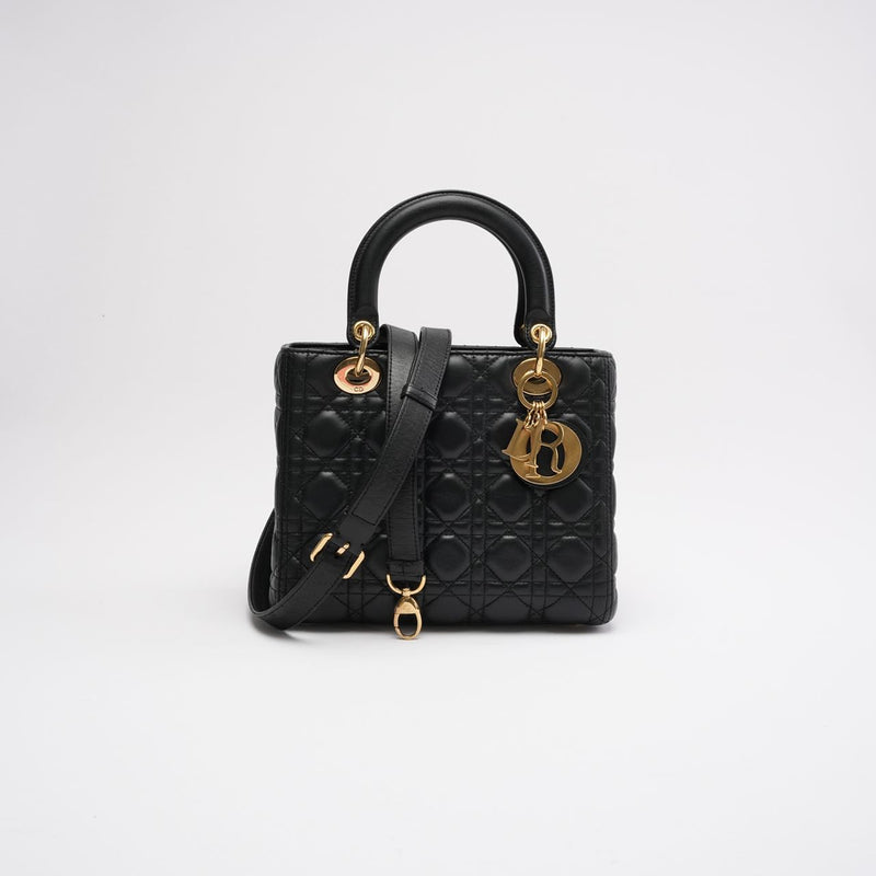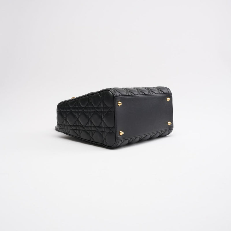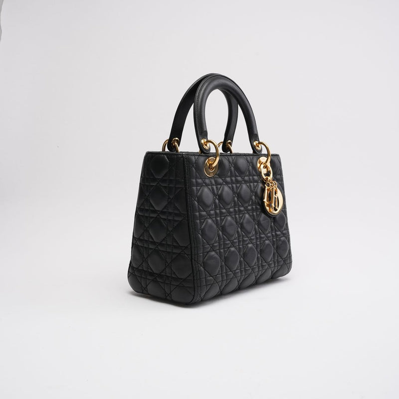 Crafted from supple black leather with the signature Cannage quilted stitching, this Lady Dior bag features structured top handles, a detachable shoulder strap, and the iconic DIOR letter charms in polished gold-tone metal. Spacious yet elegant, it is perfectly sized for everyday use or special occasions.