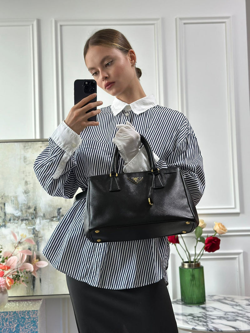 Crafted from durable Saffiano leather, the Galleria is resistant to scratches and designed to maintain its polished look for years. Gold-tone hardware, dual rolled handles, and the signature Prada triangle logo plaque highlight its luxury appeal. The spacious interior, complete with multiple compartments and pockets, ensures effortless organization.