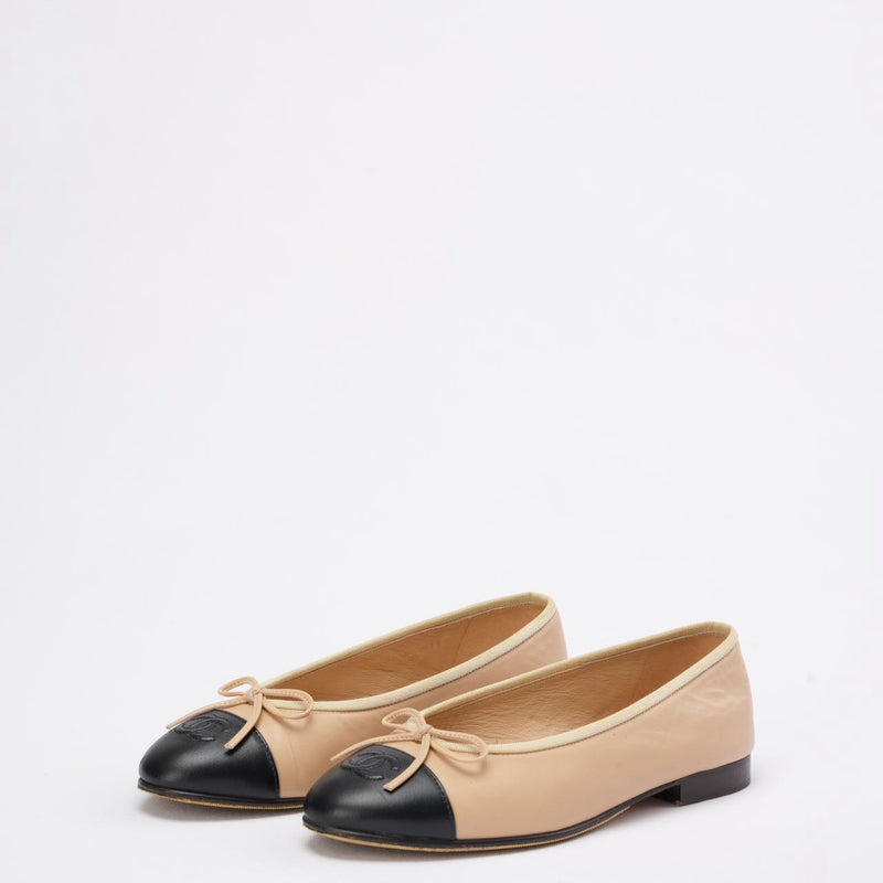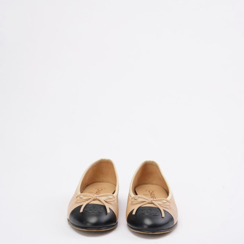 Chanel Beige/Black CC Cap Toe Ballet Flats Size 37.5