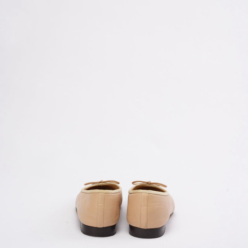 A timeless classic, the Chanel Beige and Black CC Cap Toe Ballet Flats (Size 37.5), epitomizes the maison's signature elegance and carefree Parisian style. The classic stitched CC logo is affixed to these flats, which are made of smooth beige leather with contrasting black cap toes. Delicate bow detailing adds a sophisticated touch.