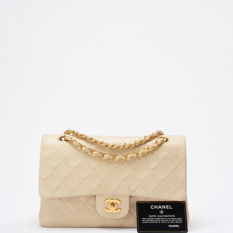 A timeless gem that epitomises Chanel's timeless elegance is the Chanel Beige Vintage Medium Classic Flap Bag in Lambskin Leather (1996–1997). This vintage beauty features the maison's signature diamond quilting and the recognisable CC turn-lock clasp. It is made from soft beige lambskin leather and is embellished with 24k gold-plated hardware. The medium size provides the ideal ratio of functionality to elegance. This piece is adaptable for both day and nighttime wear thanks to its leather-threaded chain strap, which can be worn crossbody or on the shoulder. A timeless collector's item that never goes out of style, it is a genuine vintage gem that embodies the heyday of Chanel craftsmanship.