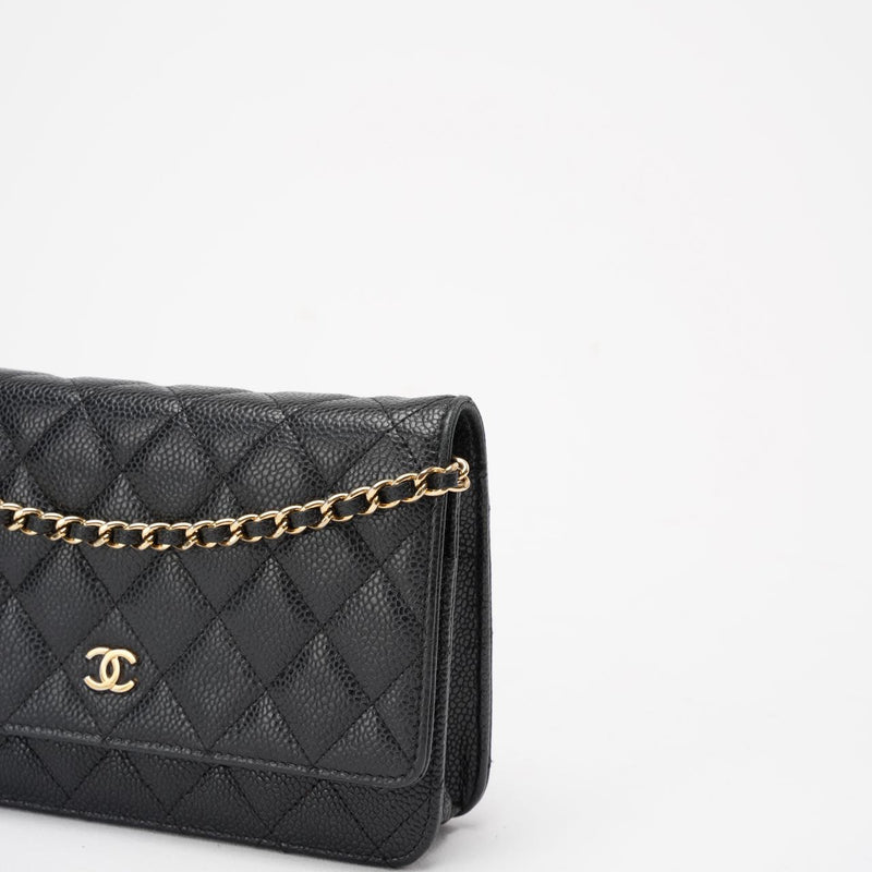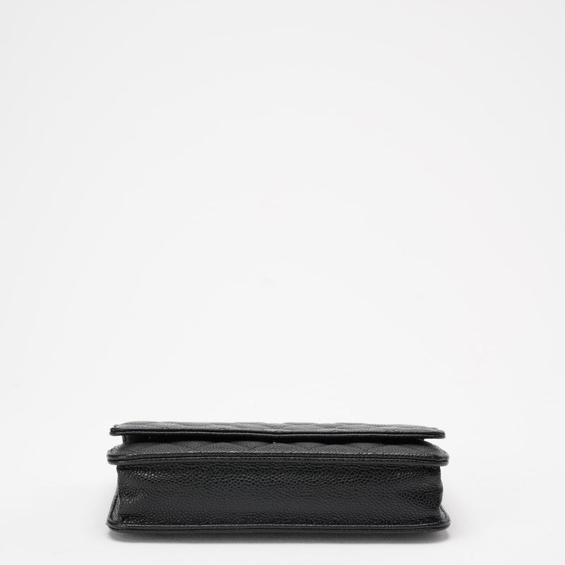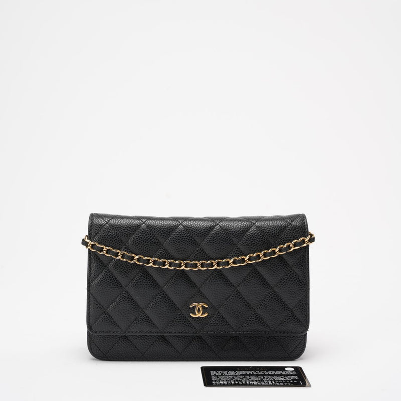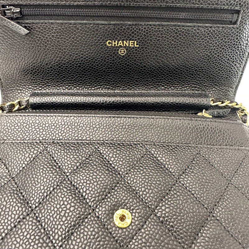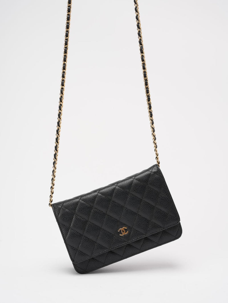This Classic Wallet on Chain (WOC) Bag, a classic Chanel staple, is made of sturdy black caviar leather with distinctive diamond quilting and gold-tone hardware. It was manufactured from 2013 to 2014 and has a leather-threaded chain strap, the recognisable CC logo on the front flap, and a neatly designed interior with several card slots, a zip pocket, and room for necessities. Small but adaptable, it can be carried as a clutch for refined minimalism, styled on the shoulder for evening elegance, or worn crossbody for carefree everyday style. This WOC epitomises Chanel's flawless harmony of fashion and utility; it is long-lasting, sophisticated, and extremely collectible. lso look for more second-hand Chanel Wallet on chain bags.