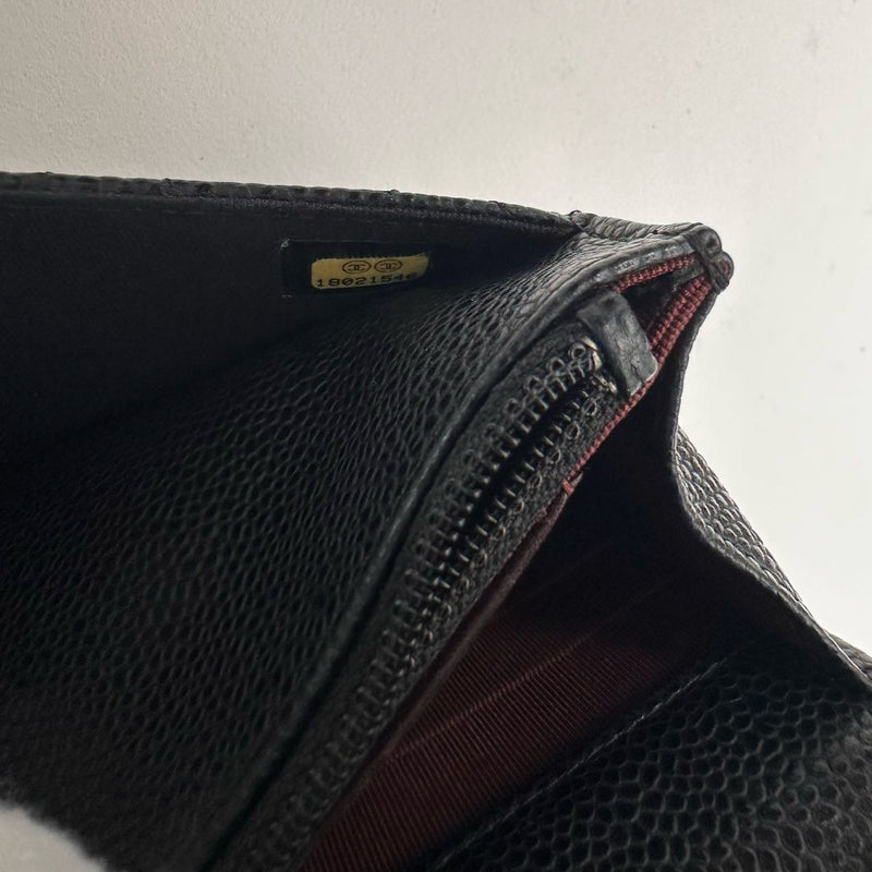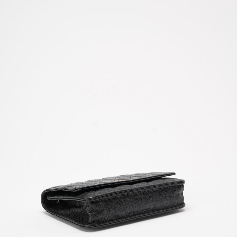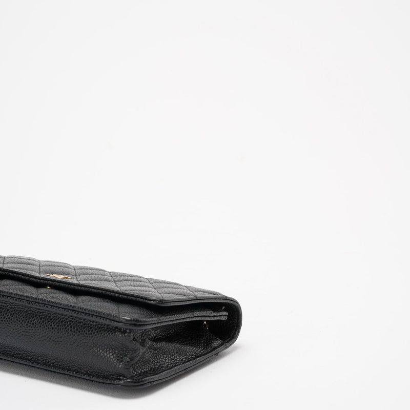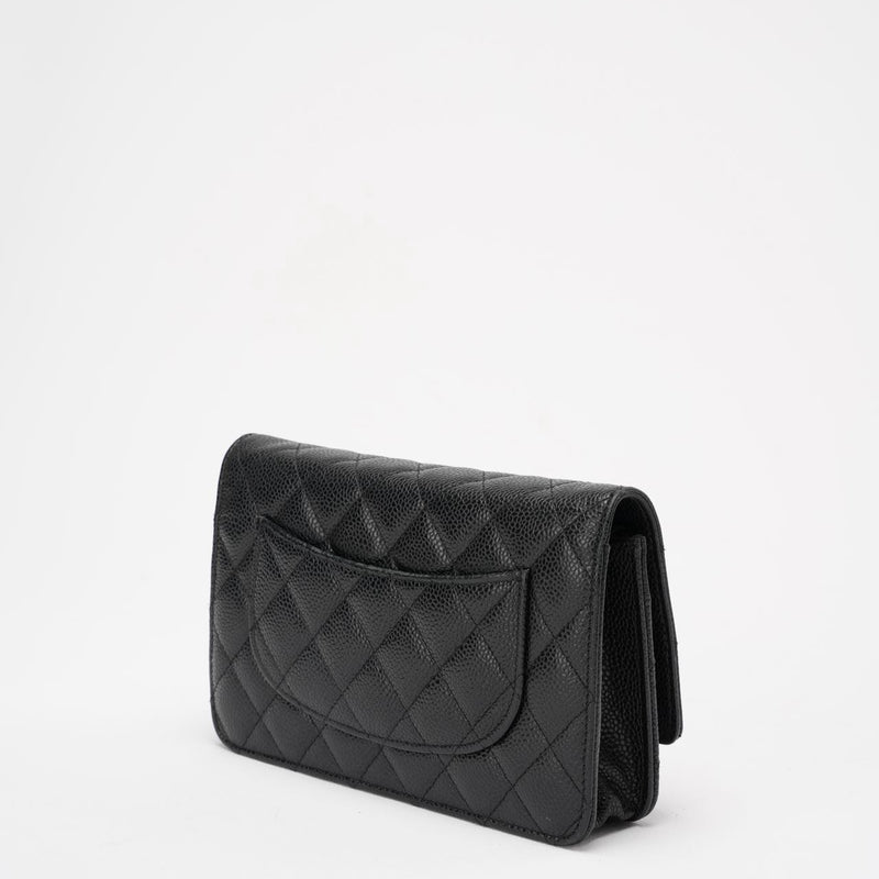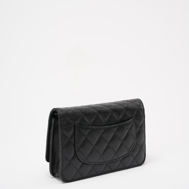 This Classic Wallet on Chain (WOC) Bag, a classic Chanel staple, is made of sturdy black caviar leather with distinctive diamond quilting and gold-tone hardware. It was manufactured from 2013 to 2014 and has a leather-threaded chain strap, the recognisable CC logo on the front flap, and a neatly designed interior with several card slots, a zip pocket, and room for necessities. Small but adaptable, it can be carried as a clutch for refined minimalism, styled on the shoulder for evening elegance, or worn crossbody for carefree everyday style. This WOC epitomises Chanel's flawless harmony of fashion and utility; it is long-lasting, sophisticated, and extremely collectible. lso look for more second-hand Chanel Wallet on chain bags.