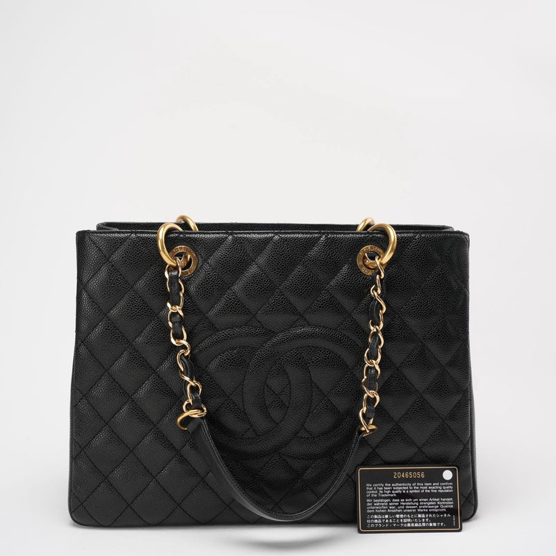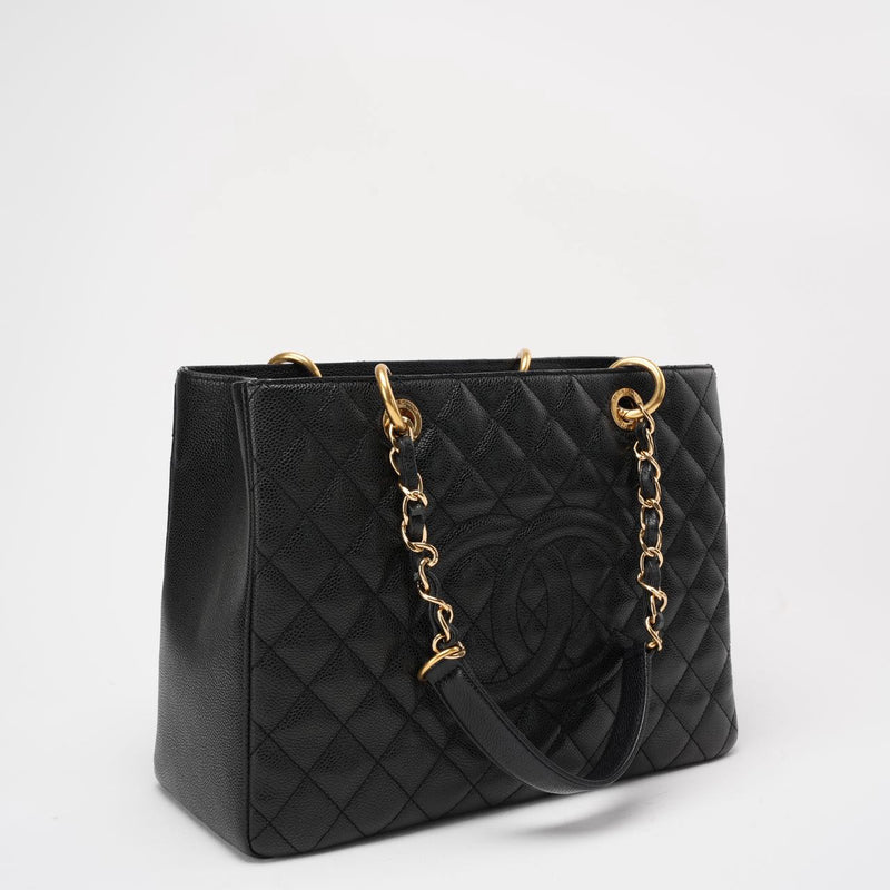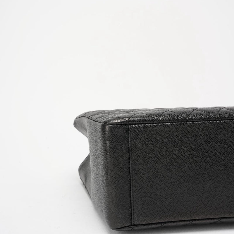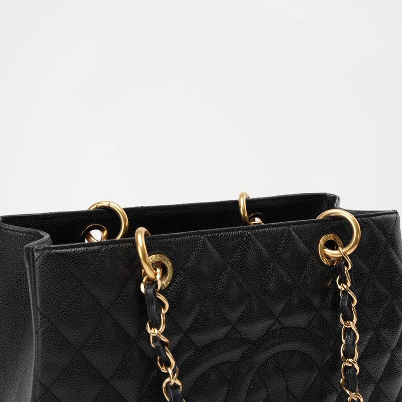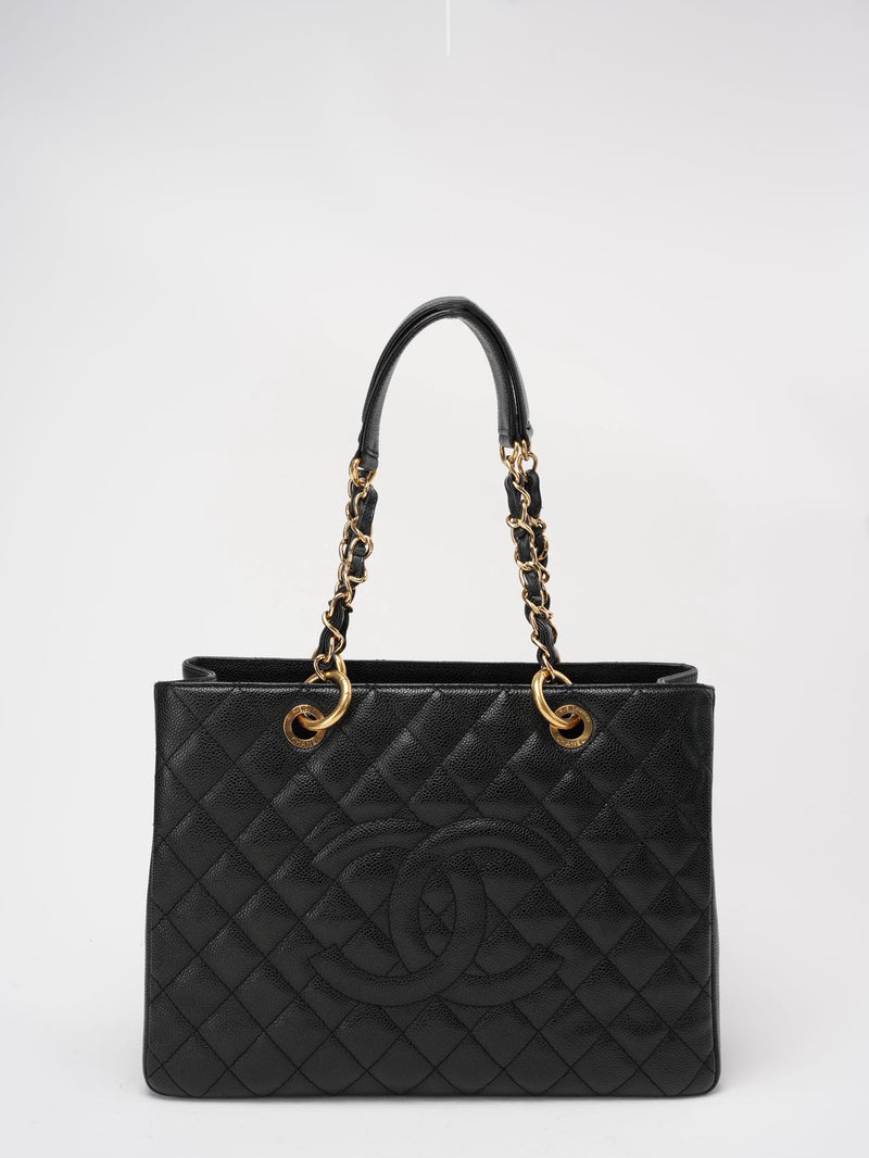 Crafted from sturdy caviar leather with classic diamond quilting, the Chanel Black Grand Shopping Tote (GST) from 2014–2015 is a true Chanel classic. It has two leather-threaded chain straps, a roomy interior with useful compartments, and the recognisable interlocking CC logo on the front, all finished with gold-tone hardware. One of Chanel's most popular carryall designs, the GST is praised for its ability to combine style with practicality. Styled on the shoulder for effortless sophistication, it's ideal for work, travel, or everyday wear and can easily hold all of your essentials.