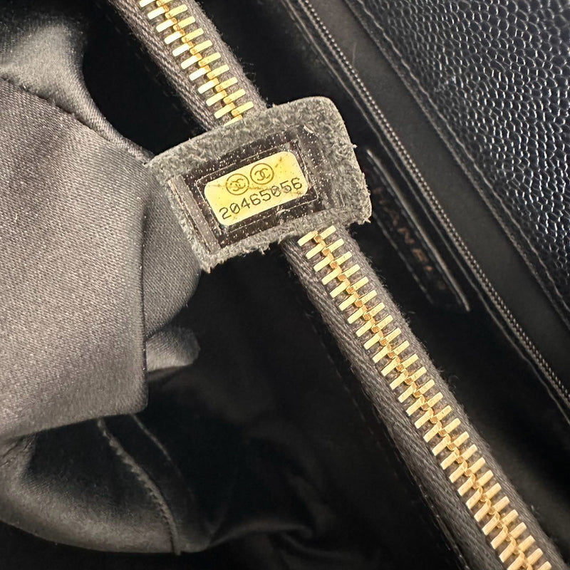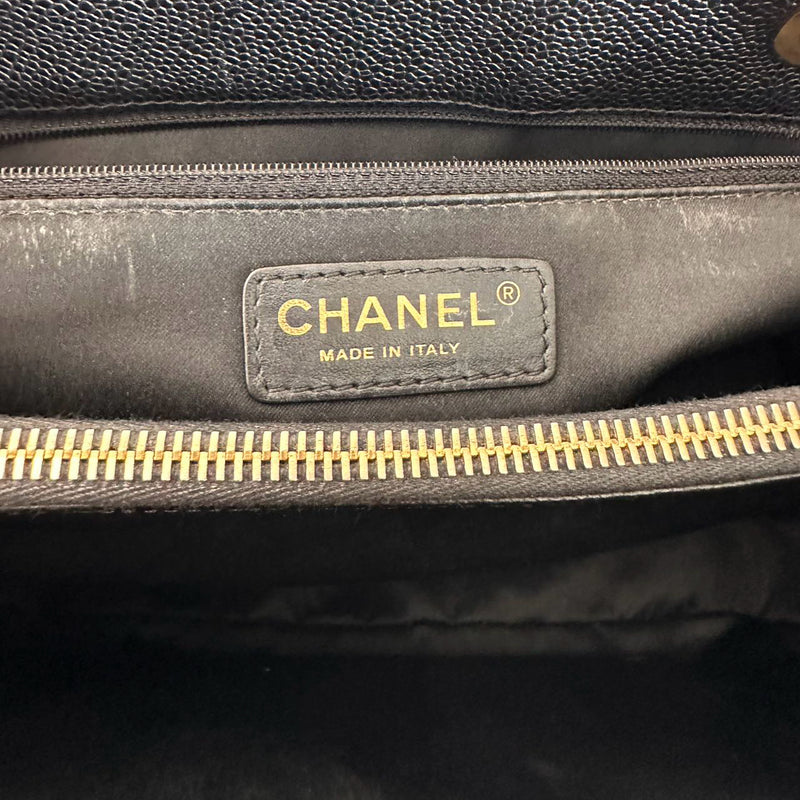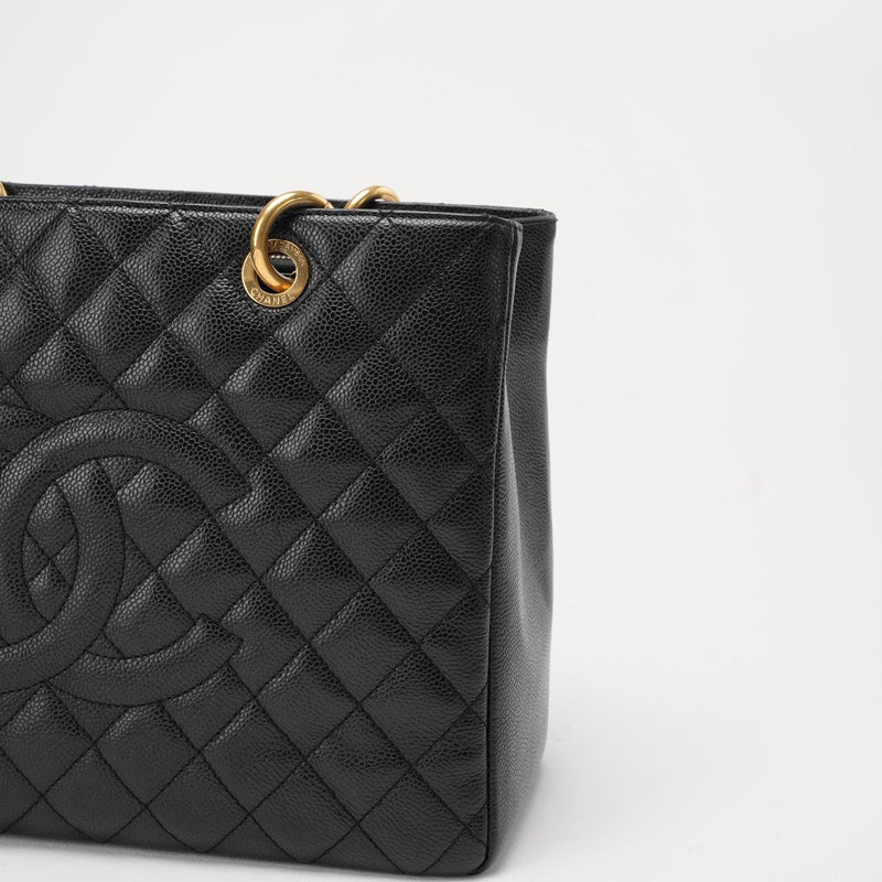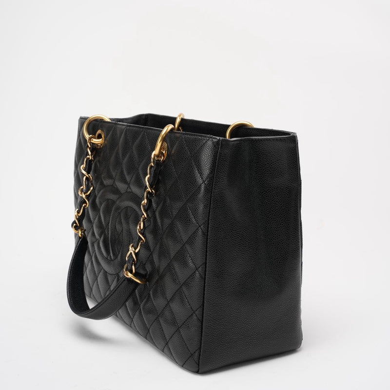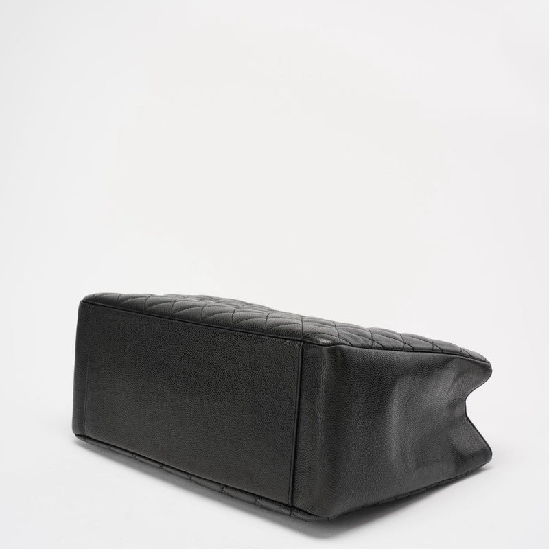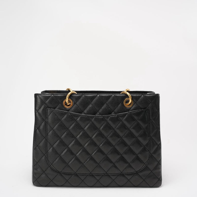 Crafted from sturdy caviar leather with classic diamond quilting, the Chanel Black Grand Shopping Tote (GST) from 2014–2015 is a true Chanel classic. It has two leather-threaded chain straps, a roomy interior with useful compartments, and the recognisable interlocking CC logo on the front, all finished with gold-tone hardware. One of Chanel's most popular carryall designs, the GST is praised for its ability to combine style with practicality. Styled on the shoulder for effortless sophistication, it's ideal for work, travel, or everyday wear and can easily hold all of your essentials.