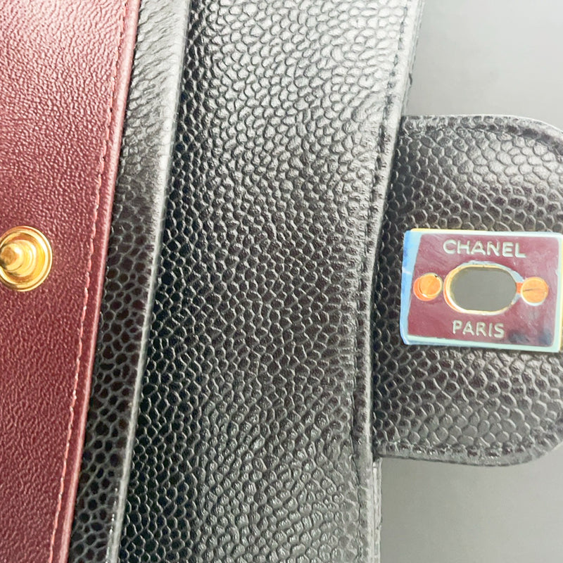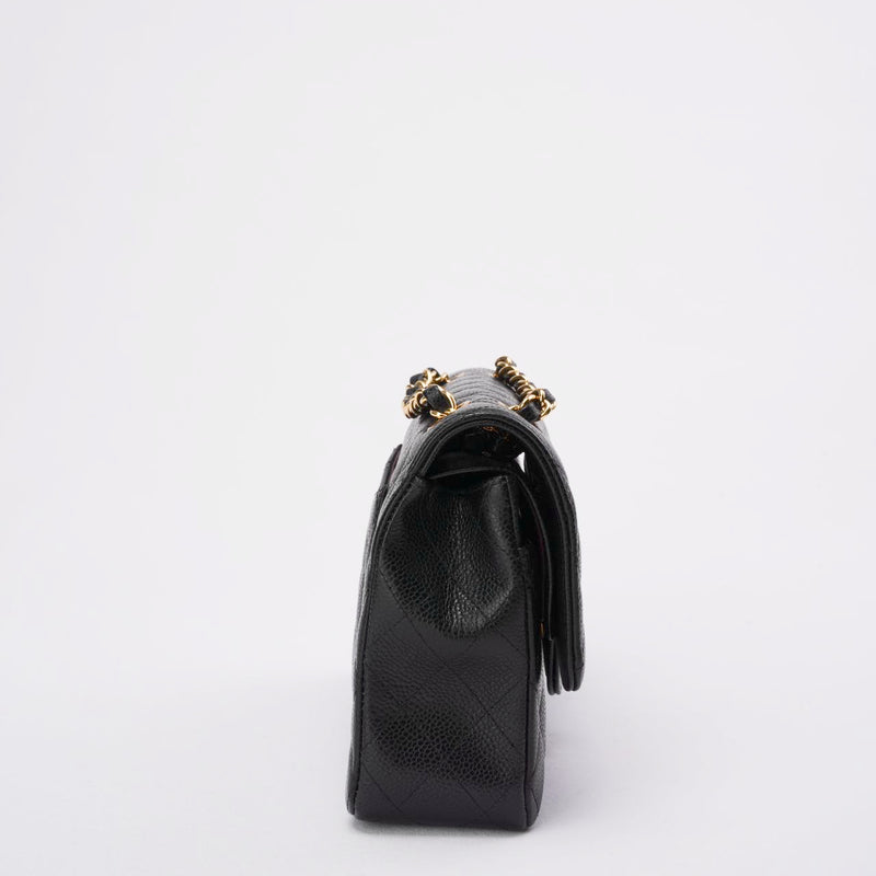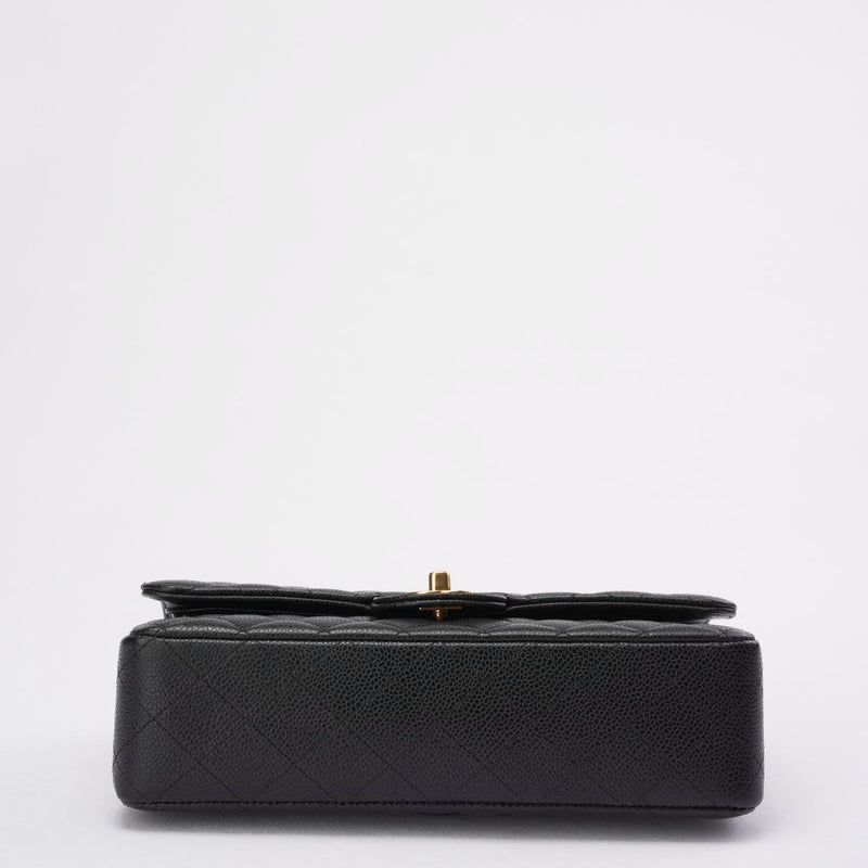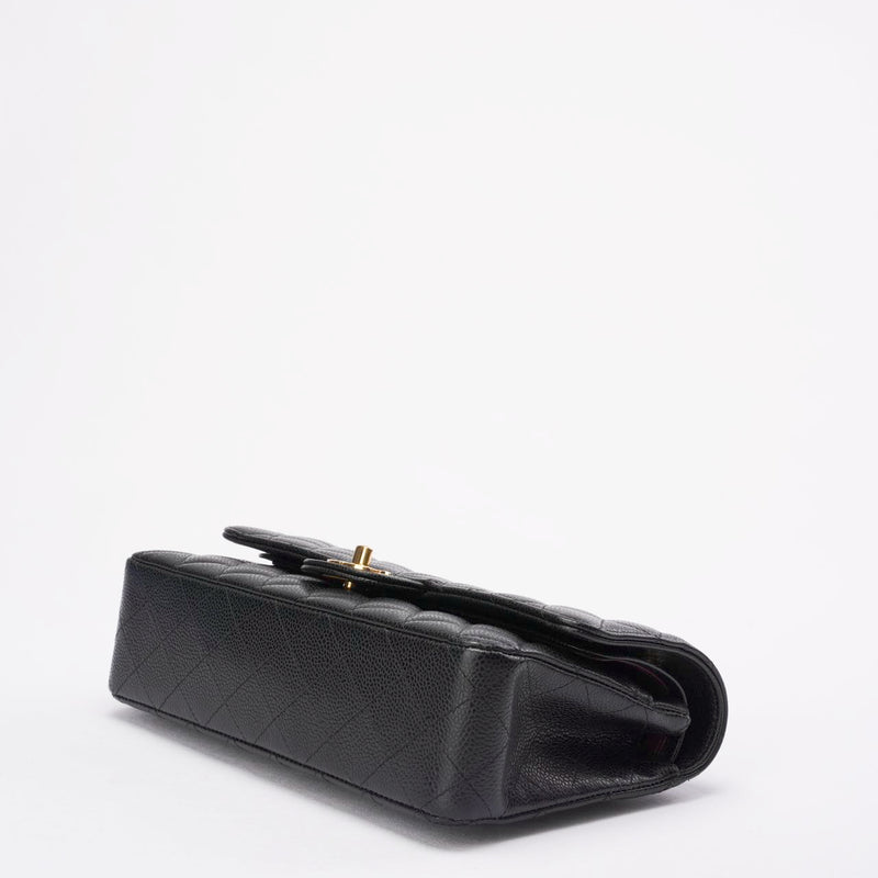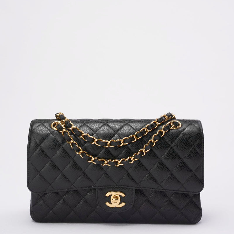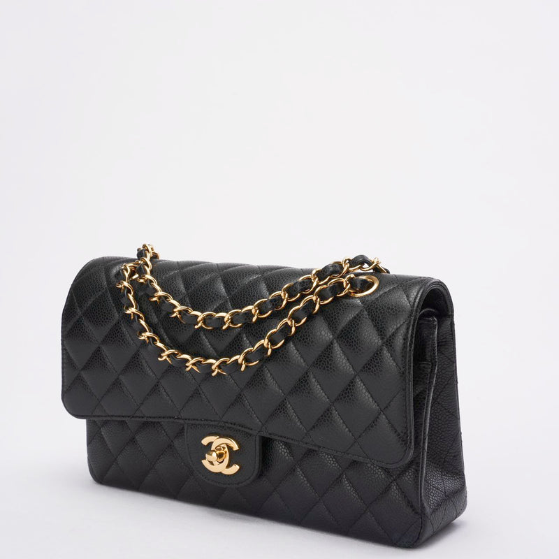 The classic item that epitomizes Chanel's timeless appeal is the Black Medium Double Flap Bag in Caviar Leather (2016–2017). This iconic bag, which features the maison's signature diamond quilting, interlocking CC turn-lock clasp, and double flap design for added structure and elegance, is made from grained black caviar leather and finished with gold-tone hardware. The leather-threaded chain strap can be worn crossbody or on the shoulder for easy sophistication.
