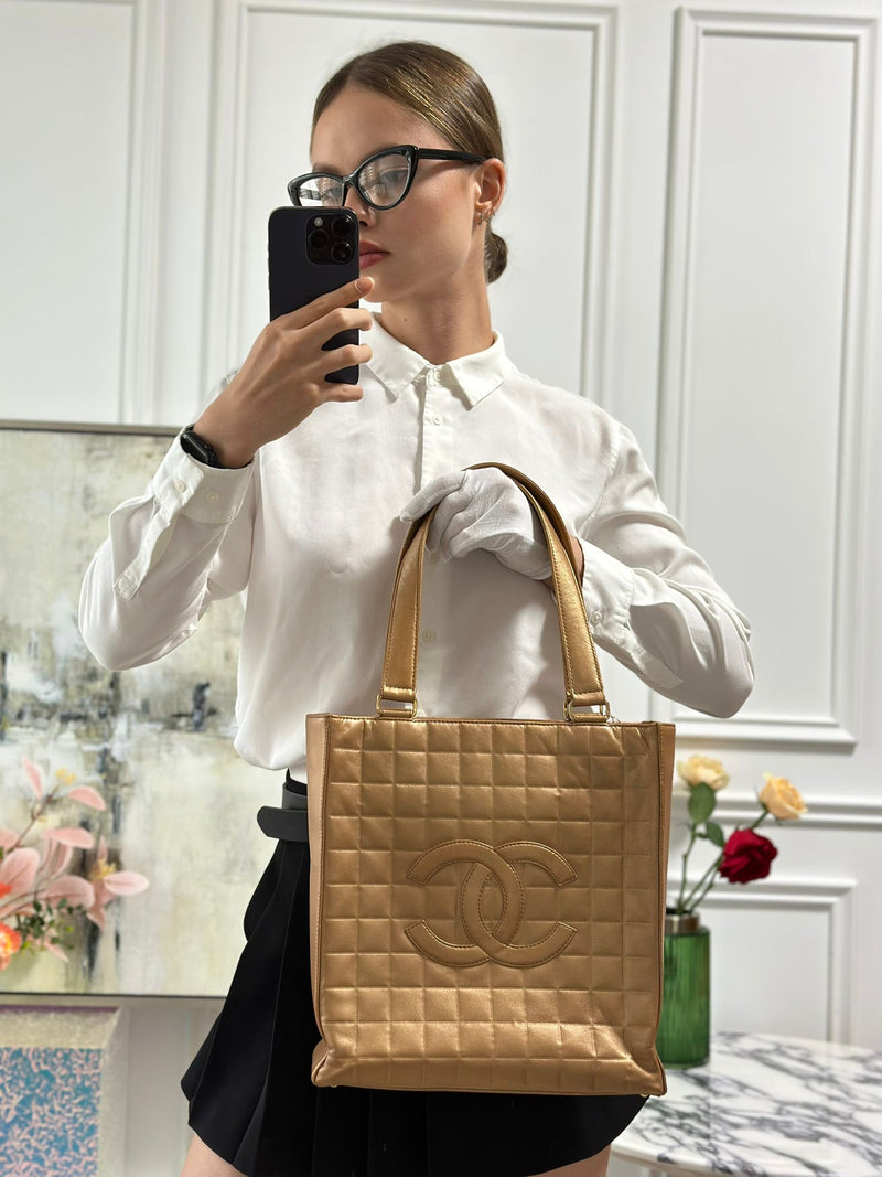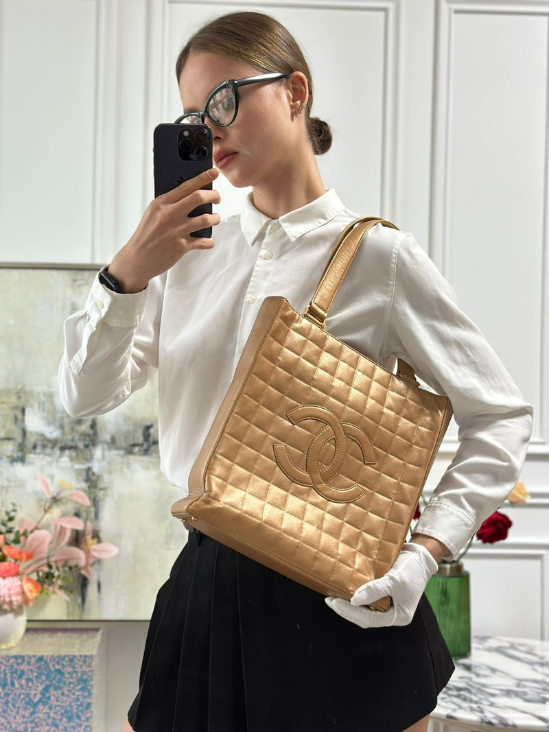 Made from glistening metallic golden leather, this Chanel CC Metallic Golden Tote Bag has gold-tone hardware and the recognisable CC logo. The tote, which was manufactured between 2000 and 2002, is both functional and fashionable thanks to its roomy interior. It can be worn on the shoulder for a refined daytime look, or carried in the hand for a stylish, upmarket ensemble. It is a collectible piece that skilfully blends luxury with everyday functionality thanks to its eye-catching metallic finish and classic Chanel detailing. This iconic vintage piece will come in good vintage condition.