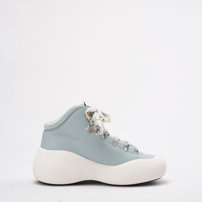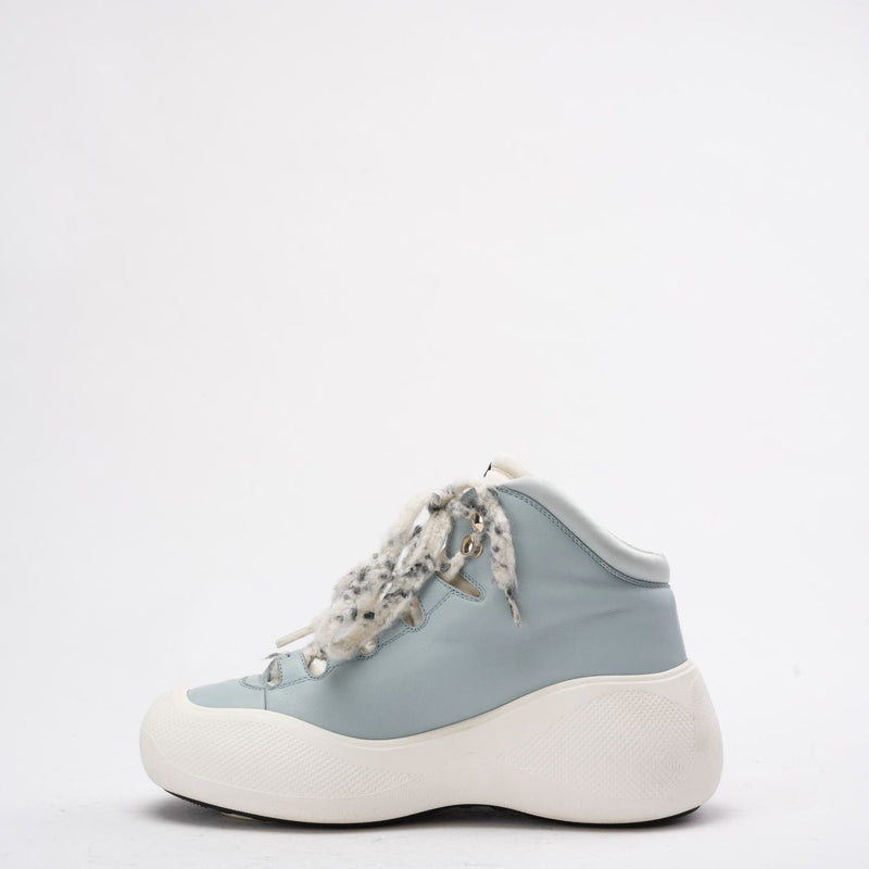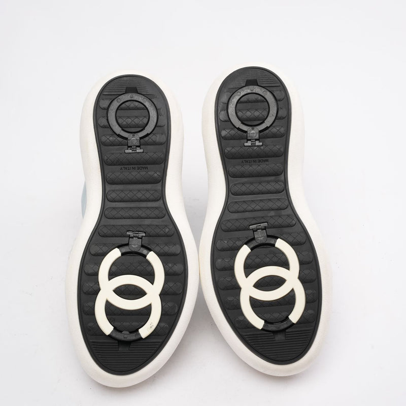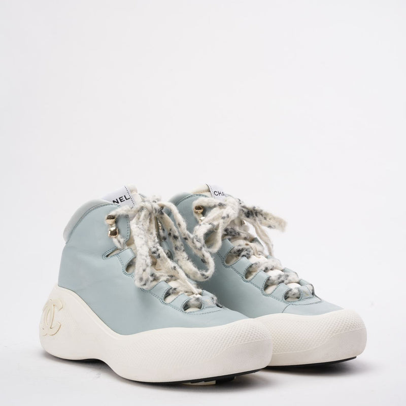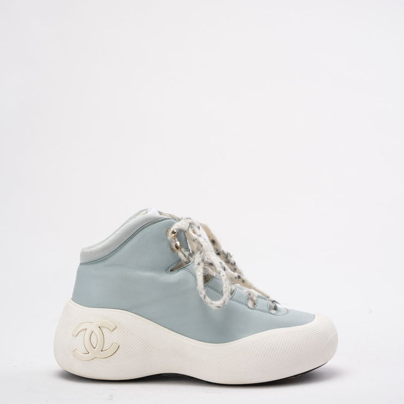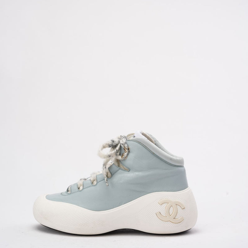 The Chanel Light Blue and White Snow CC Logo Top Ankle Boots (Size 39.5) are a playful yet luxurious take on winter footwear. Crafted from soft leather and textile, these boots feature a striking light blue and white colorway accented with the iconic CC logo on the top, showcasing Chanel’s signature style even in sporty designs.