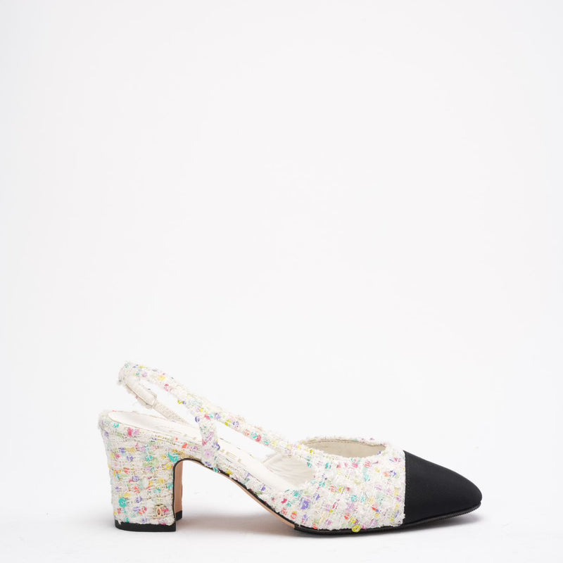 A vibrant expression of Chanel’s signature elegance, these slingback pumps are crafted from richly textured multicolor tweed, showcasing the House’s iconic use of color and craftsmanship. The classic cap-toe silhouette is elevated with the interlocking CC logo, adding a timeless touch to the playful tweed finish.