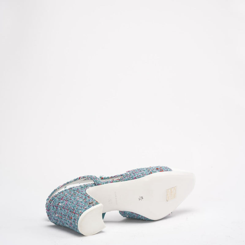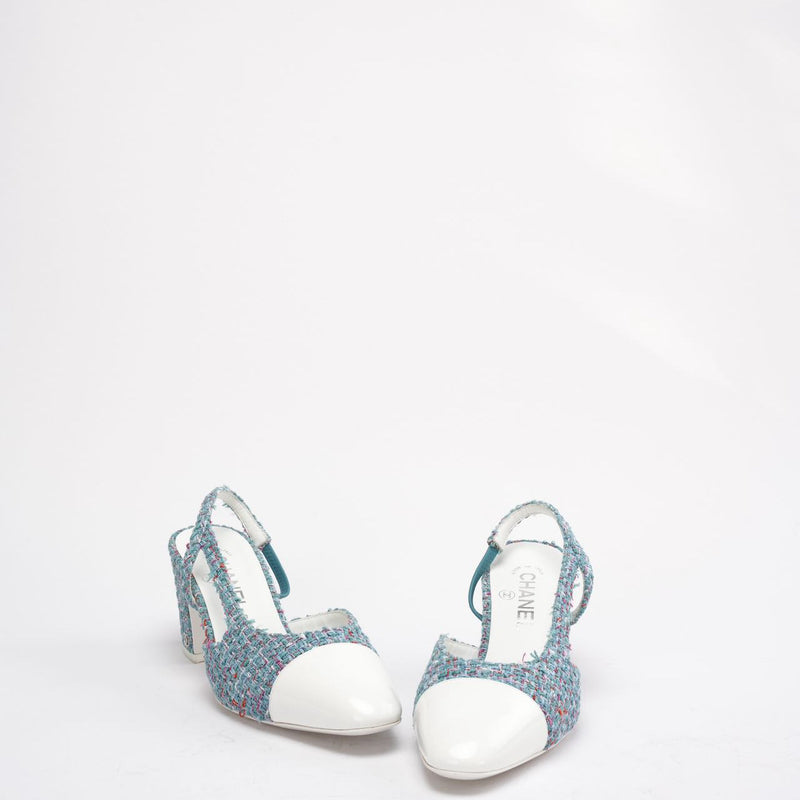 A vibrant yet elegant statement, these Chanel pumps are crafted from textured tweed in a striking Tiffany blue hue, beautifully contrasted with smooth leather accents. The design is finished with the signature interlocking CC logo, blending classic Chanel codes with a fresh, contemporary edge.