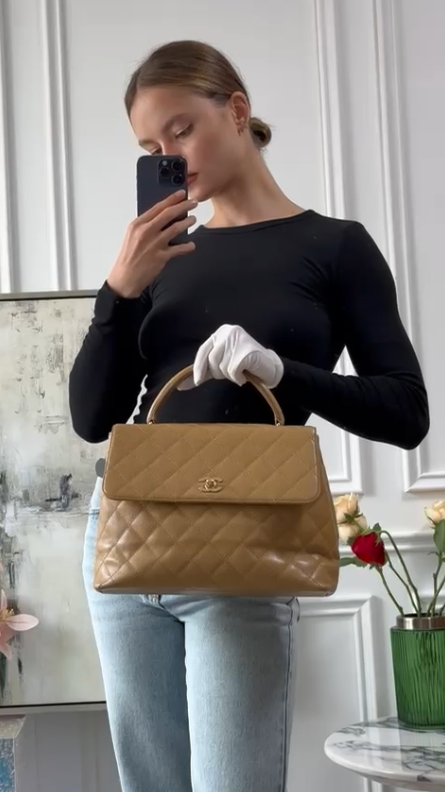 Crafted from sturdy beige caviar leather and embellished with gold-tone hardware, this Chanel Kelly Top Handle Flap Bag is a sophisticated vintage gem. Made between 2004 and 2005, it has an interlocking CC turn-lock closure, Chanel's signature diamond quilting, and a structured top-handle silhouette reminiscent of the iconic Kelly design. it can be carried elegantly by hand. A timeless and elegant addition to any Chanel collection, this piece is extremely collectible. This preloved brown Kelly will come in good vintage condition. Also, look for it in Chanel vintage Kelly pink.