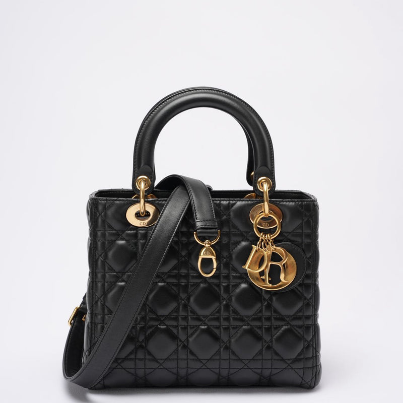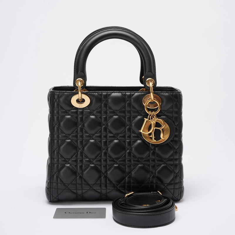 This Christian Dior Medium Lady Dior bag is crafted in luxuriously soft black lambskin leather with elegant gold-tone hardware. The piece is from 2017 and remains in excellent condition, having been used only once or twice with great care.
