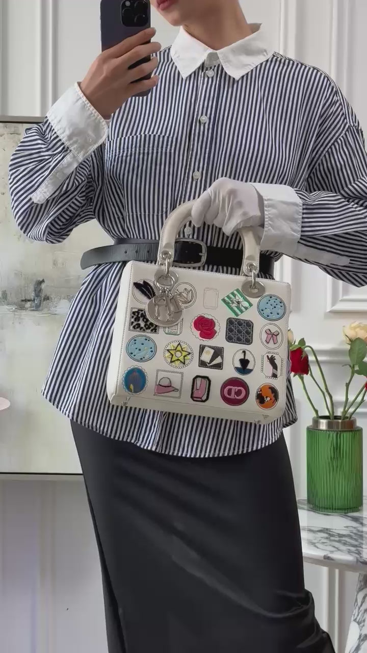 A playful twist on an iconic silhouette, this authentic pre-owned Christian Dior Medium Lady Dior Bag is crafted from smooth white leather and uniquely adorned with patch-style embellishments, giving it a fresh, contemporary edge while honoring the timeless Dior design.