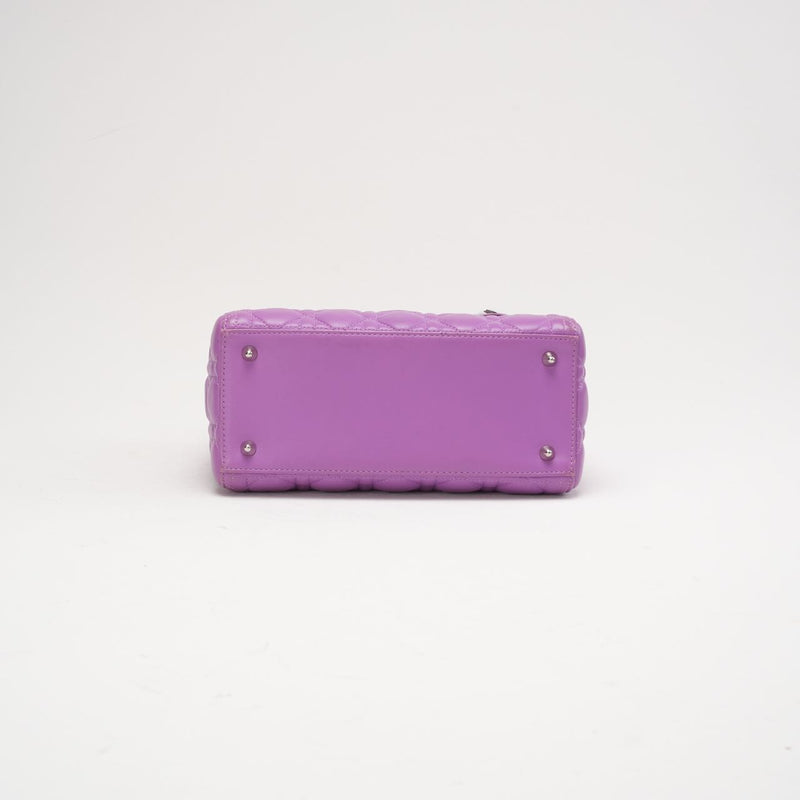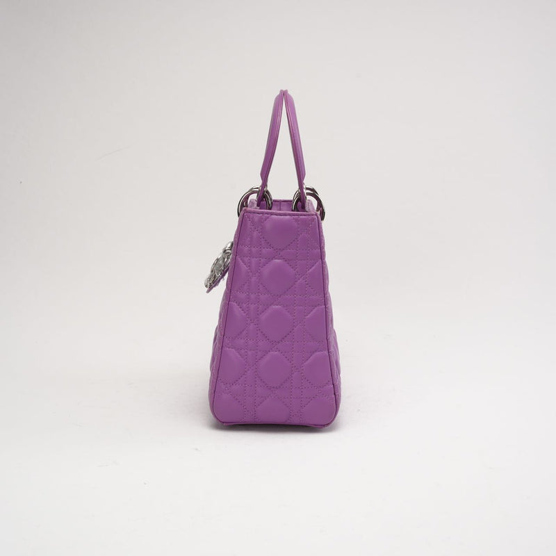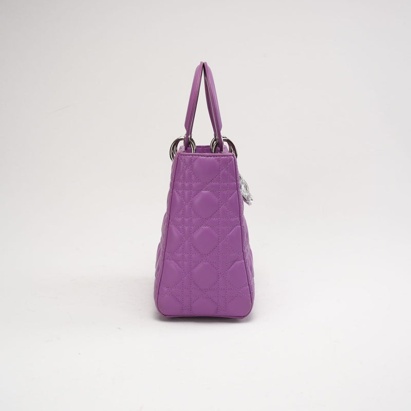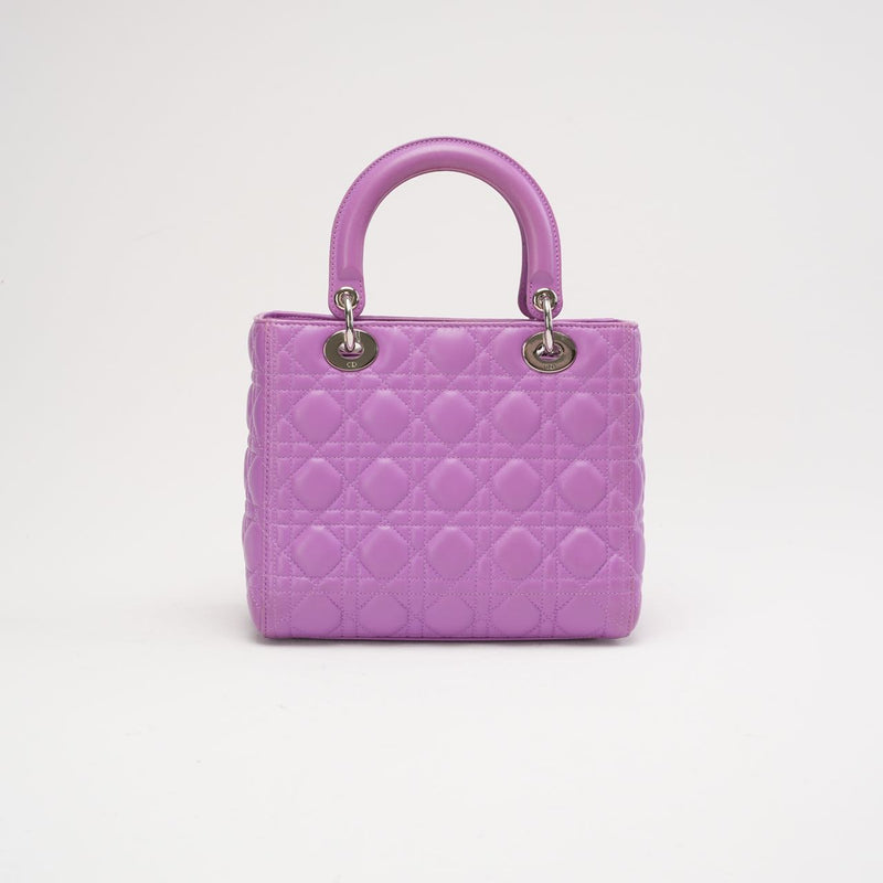 This iconic Lady Dior Medium Bag in purple lambskin leather with silver hardware was produced in 2014. Elegant and timeless, it features the signature Cannage quilting, structured silhouette, and Dior letter charms, showcasing the house’s exceptional craftsmanship. The medium size offers the perfect balance of style and practicality for everyday essentials, while the top handles and shoulder strap allow versatile wear.
