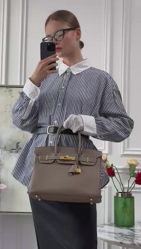 Crafted in supple Togo leather in the sought-after Etoupe shade, a neutral that embodies subtle elegance, this Hermès Birkin 30 Sellier is a modern icon. The bag's architectural lines are accentuated by the structured Sellier construction, which provides a sophisticated interpretation of the traditional Birkin silhouette. This piece highlights Hermès' well-known craftsmanship and classic appeal when paired with sleek gold-plated hardware. Completely hand-stitched using the maison's renowned saddle technique, it is a daily necessity as well as a luxury statement. I will come with the lock and keys.