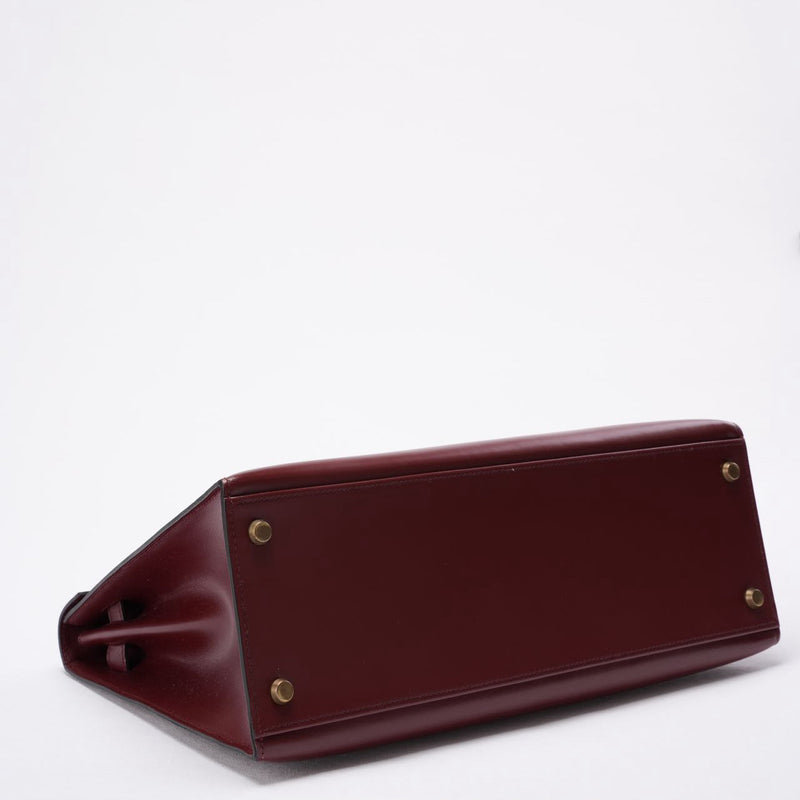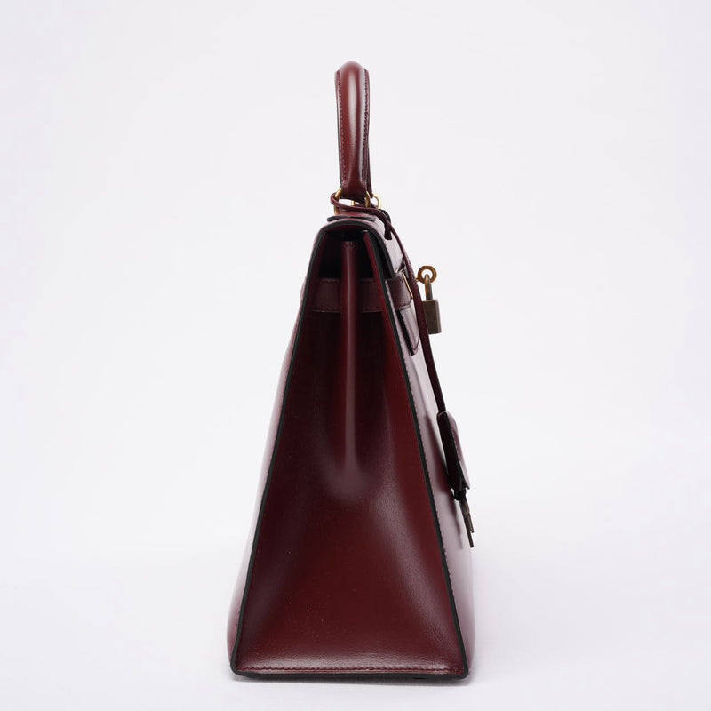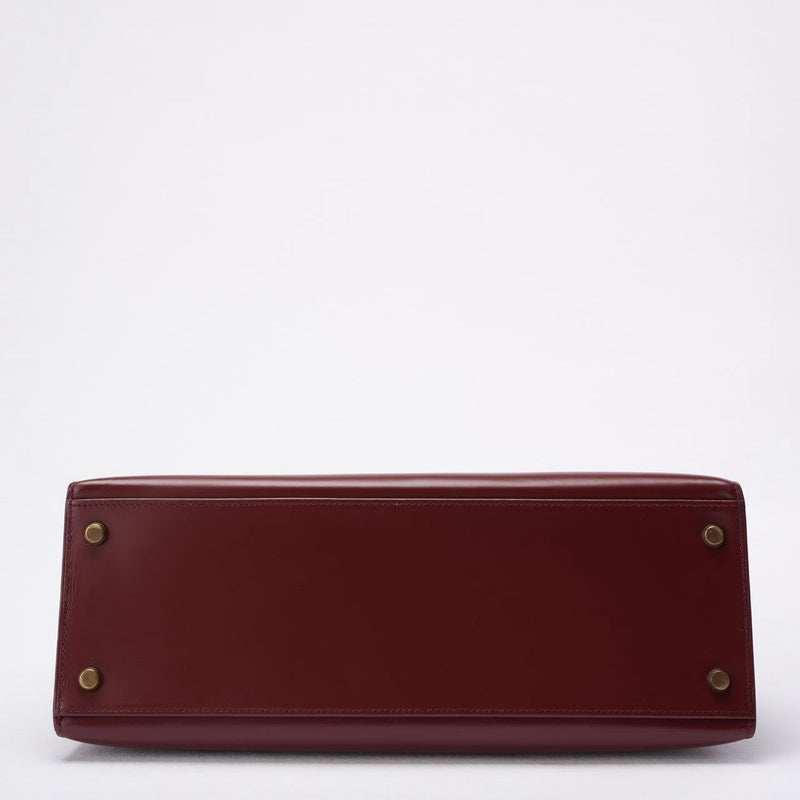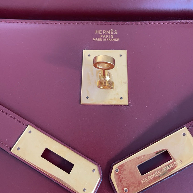 A genuine collector's item, the Hermès Vintage Kelly 32 in Burgundy Red Box Leather (1985) radiates classic French elegance and ageless sophistication. This classic piece is expertly crafted by hand from smooth Box Calf leather in a deep burgundy colour. Its gold-plated hardware perfectly matches its opulent tone. Hermès' exquisite craftsmanship and sophisticated attention to detail are on full display in the structured Sellier silhouette.