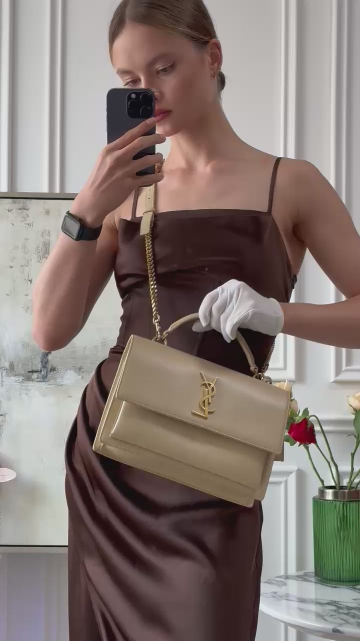 Elevate your wardrobe with this timeless pre-loved Saint Laurent Sunset Medium Bag in luxurious beige calfskin leather. Featuring the iconic YSL monogram, structured silhouette, and refined gold-tone hardware, this piece exudes effortless Parisian chic.